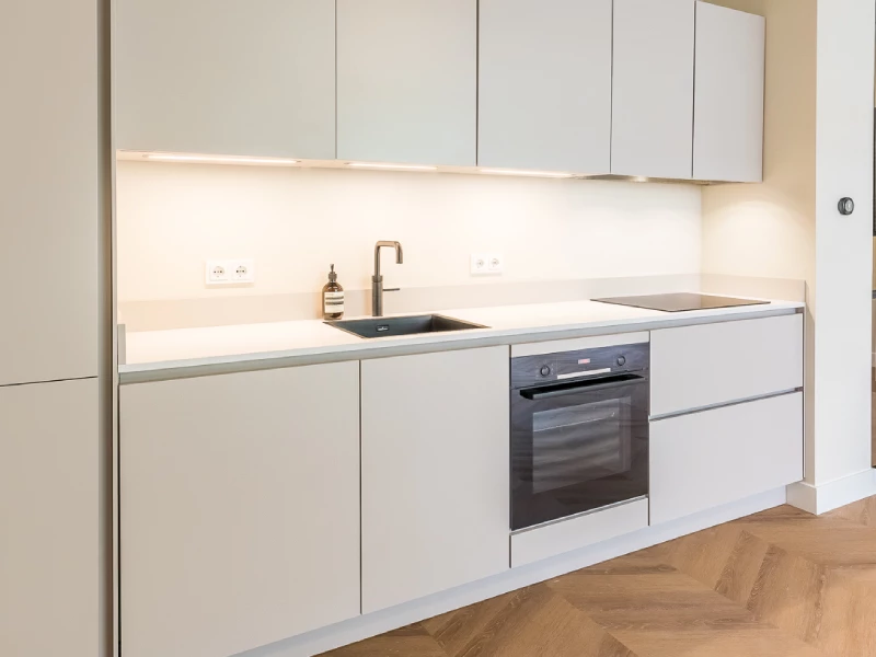 Het is misschien niet het eerste waar je aan denkt, maar het kan wel een grote invloed hebben op de uitstraling van je keuken: de keukenverlichting. Je wil natuurlijk dat je keuken zo mooi mogelijk uitkomt, maar je wil ook wat kunnen zien tijdens het koken. Daarom begin je altijd met de basisverlichting, het gaat hier om de centrale verlichting. Vaak wordt er gekozen voor een plafondlamp. Hierna kun je beslissen welke verlichting je nog toevoegt aan de keuken. Zo kun je extra werkverlichting toevoegen waardoor je bijvoorbeeld het werkblad beter ziet. Maar je kan ook kiezen voor sfeerverlichting, waarmee je dus extra sfeer toevoegt aan de keuken. In deze keuken is er naast de centrale verlichting ook werkverlichting boven het werkblad toegevoegd. Er is gekozen voor ledverlichting die in de kasten zijn geïntegreerd. Je ziet de lampen dus niet zitten, maar geniet wel van de voordelen van de verlichting.