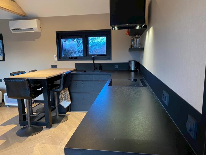 Een klein appartement betekent niet dat je geen luxe keuken kunt hebben. Er zijn best veel mogelijkheden qua keuken in een klein huis, zolang je het maar slim aanpakt. Met de juiste keuzes creëer je een keuken die groter lijkt en waarin de ruimte optimaal benut wordt. In deze hoekkoeken is er veel werkruimte. De zwarte kubus Airforce afzuigkap past perfect in deze moderne en eigentijdse keuken. De keuken oogt chique doordat deze compleet zwart is. Voor de fronten is decor eiken Nero gekozen. Deze komen uit de structura serie, hierdoor hebben de fronten een mooie chique houtnerf. Het werkblad is een toplaminaat werkblad. De inbouwkoelkast met vriesvak komt van Pelgrim. De zwarte kraan en wasbak van Lanesto maken deze stijlvolle keuken helemaal af.