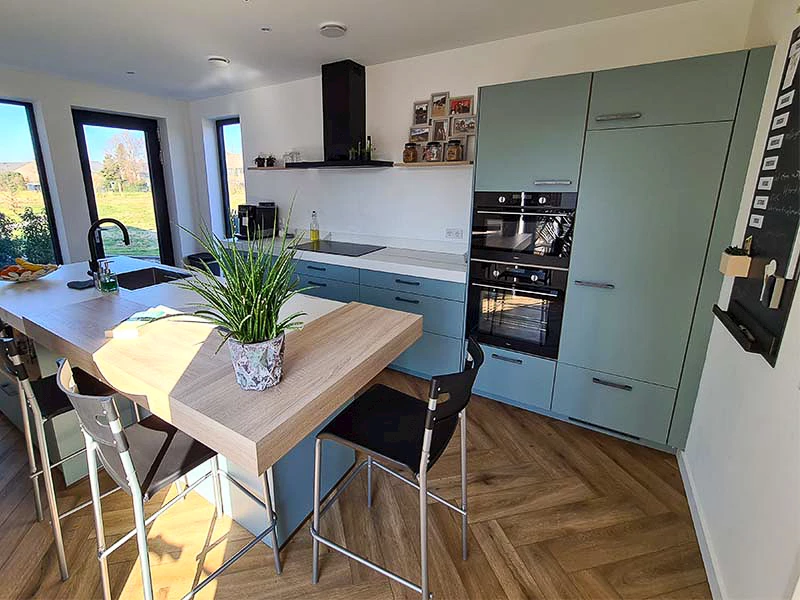 Niet alleen de kleur van deze keuken is uniek, er zijn meerdere elementen die deze keuken uniek maken. Denk bijvoorbeeld aan de opstelling van de keuken. Gekozen is voor een rechte keuken met kookeiland én keukenbar. Waar er vaak voor gekozen wordt om bij een keukenbar het werkblad door te laten lopen, heeft deze familie een andere keuze gemaakt. Er is namelijk een barblad aangebracht in de kleur Decor eiken Virginia. Het materiaal en de kleur zorgen ervoor dat je het echte gevoel van een bar creëert.