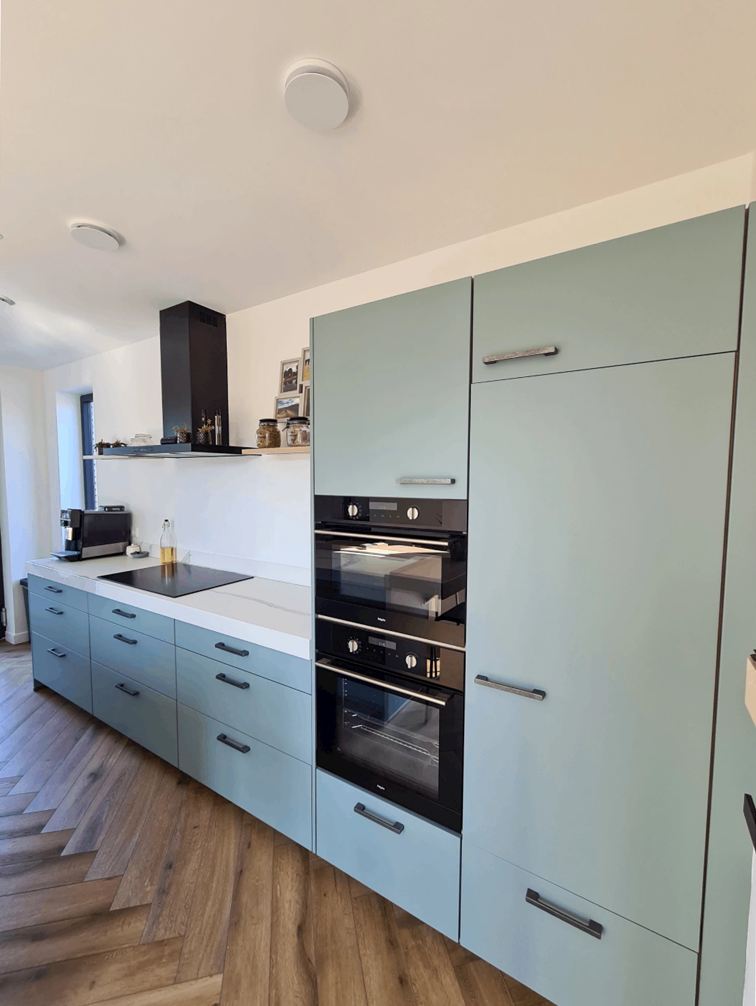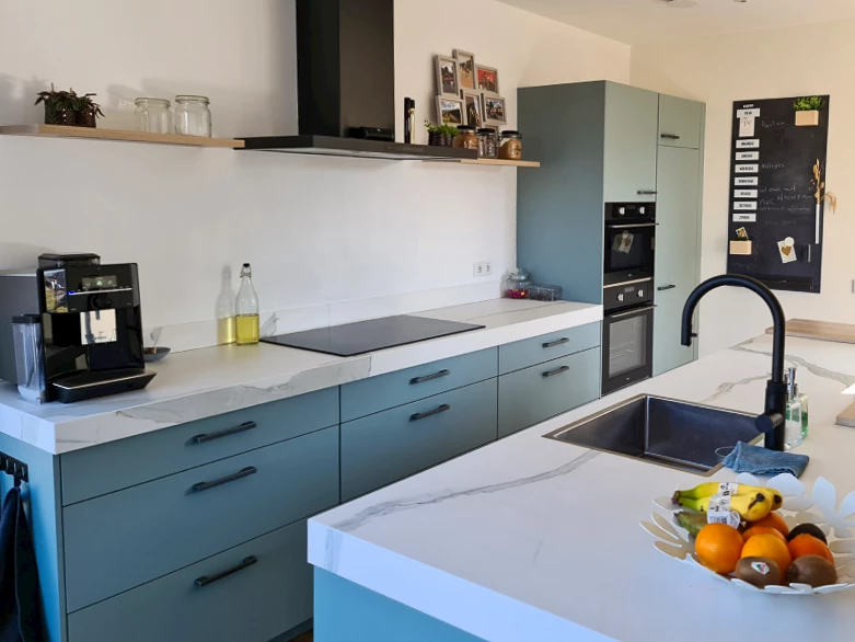 Het eerste wat je waarschijnlijk opvalt is de kleur van de keuken. Er is gekozen voor fronten in de kleur Aqua Supermat, een unieke lichtblauwe kleur. De fronten zijn gecombineerd met een keramieken werkblad in de kleur Spirit Honed. De combinatie van de lichtblauwe fronten en het marmerlook werkblad zorgt voor een speelse en prachtige uitstraling. Op de fronten zijn zwarte grepen geplaatst. Gekozen is voor een kokend waterkraan van Selsiuz, deze heeft net zoals de grepen een zwarte kleur. Dit zorgt voor eenheid in de ruimte. Een keuken is natuurlijk niet compleet zonder apparatuur, alle apparaten in deze keuken zijn van het merk Pelgrim. Er is onder andere gekozen voor een oven, combi-oven en een inductiekookplaat.