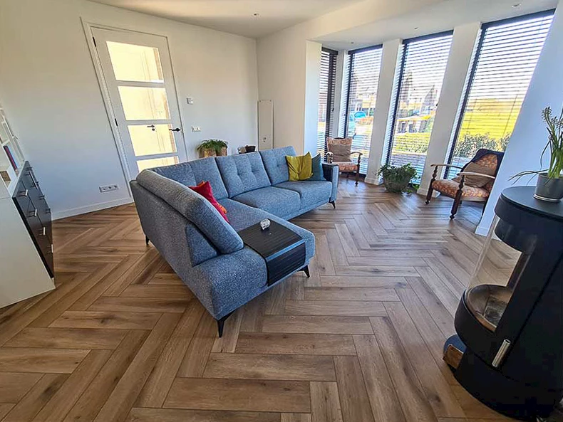 De familie heeft niet alleen een keuken uitgezocht bij Kitchen4All, maar ook een pvc-vloer. Gekozen is voor een visgraatvloer in de kleur Natural Oak, een stoerdere maar stijlvolle kleur. De vloer is gelegd in de woonkamer, keuken en hal. Hierdoor ontstaat er eenheid in de ruimtes. Pvc is een zeer geschikt materiaal voor ruimtes als de keuken. Het is bestand tegen een stootje, waardoor de vloer niet snel beschadigt. Dit maakt pvc ook duurzaam; de vloer blijft lang(er) mooi, waardoor je deze minder vaak hoeft te vervangen dan bij bijvoorbeeld laminaat. Ben je ook op zoek naar een nieuwe keuken en een nieuwe vloer? Maak dan snel een afspraak bij een van onze keukenwinkels.