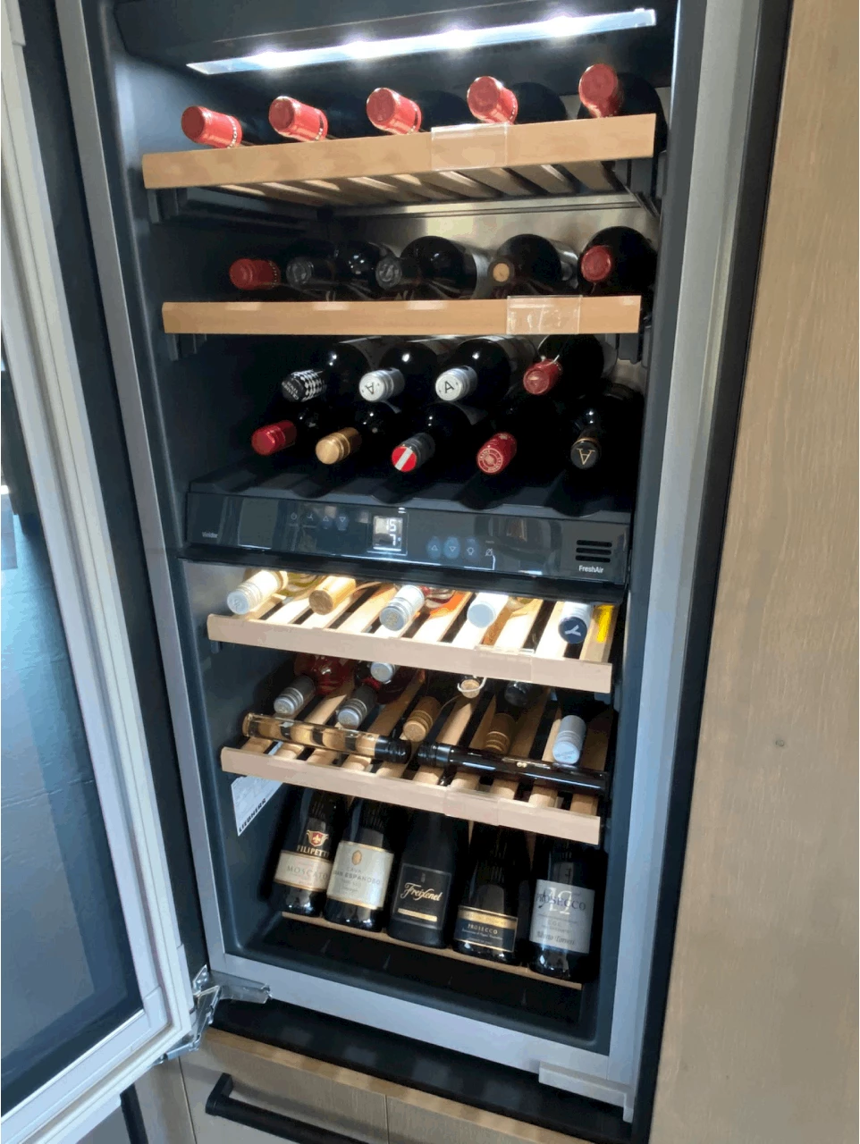 Voor wijnliefhebbers is een wijnklimaatkast een absolute aanrader. Een wijnklimaatkast zorgt er namelijk voor dat de wijn op de juiste temperatuur bewaard wordt en daardoor goed blijft. Vaak beschikken wijnklimaatkasten over verschillende temperatuurzones, waardoor je er verschillende soorten wijn in kan leggen. Naast de praktische voordelen zijn wijnklimaatkasten een prachtige en luxe toevoeging aan je keuken. De wijnklimaatkast in deze keuken is van het merk Liebherr en beschikt ook over diverse temperatuurzones.