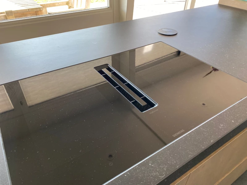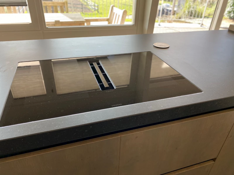 Keramiek is een natuurlijk materiaal dat gemaakt wordt van kleipoeder. Dit poeder wordt onder hoge druk geperst, waardoor het een zeer sterk materiaal is. Daarnaast zijn de bladen makkelijk in onderhoud; ze zijn namelijk vlek-, hitte-, en krasbestendig. Een ander voordeel is de uitstraling van keramieken werkbladen. Het is een luxe materiaal dat zorgt voor een natuurlijke en luxe sfeer in de keuken. Keramiek is in veel verschillende soorten kleuren en maten verkrijgbaar, waardoor je deze helemaal naar jouw smaak kan kiezen. In deze keuken is er gekozen voor een keramieken werkblad van 6 cm dik in de kleur Belgian Fossil.