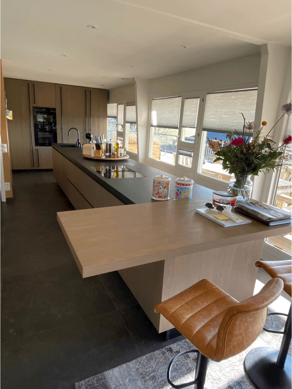 Het werkblad in de kleur Belgian Fossil is van keramiek en combineert prachtig bij de massief houten eiken fronten. Op de fronten zijn grepen in de kleur Metal geplaatst. Deze zijn niet horizontaal, maar verticaal op de fronten gemonteerd, wat voor een strakke uitstraling zorgt. Naast een kraan heeft de familie ook gekozen voor twee zeeppompen, allen hebben een zwarte kleur. Hiermee combineren ze perfect bij de zwarte stenen spoelbak en het donkere werkblad. Doordat er voornamelijk gebruikgemaakt is van zwarte accenten, behoudt de keuken de strakke en rustige uitstraling. Door de hoge kastenwanden en het kookeiland is deze keuken niet alleen prachtig, maar ook nog eens heel praktisch.