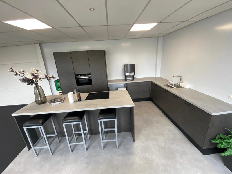 Gekozen is voor een Nobilia keuken in de kleur Decor Beton Terra Grijs. Het keukenblad van kunststof in de kleur Decor Beton Grijs combineert hier perfect bij. De betoonlook zorgt ervoor dat de keuken de tijdloze en strakke uitstraling krijgt. De strakke stijl zie je ook terug in de gekozen apparatuur; alle apparatuur is ingebouwd. Dit zorgt er ook voor dat de keuken netjes en rustig oogt. Het bedrijf heeft ervoor gekozen om op de vaatwasser en koelkast een doorlopend deurfront te laten bevestigen. Om opbergruimte te creëren is een voorraadkast in de keuken aangebracht. Op de kastdeuren zijn metalengrepen in de kleur Titanium aangebracht. Dit combineert goed met zowel de wasbak als de kraan, beide zijn van rvs. Omdat dit materiaal niet kan roesten is dit een duurzame optie.