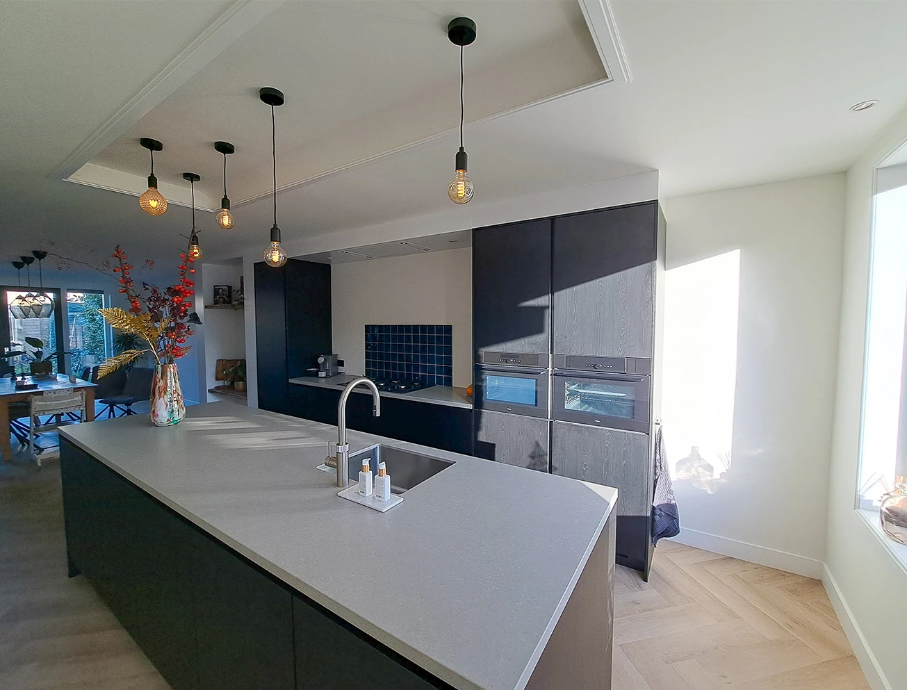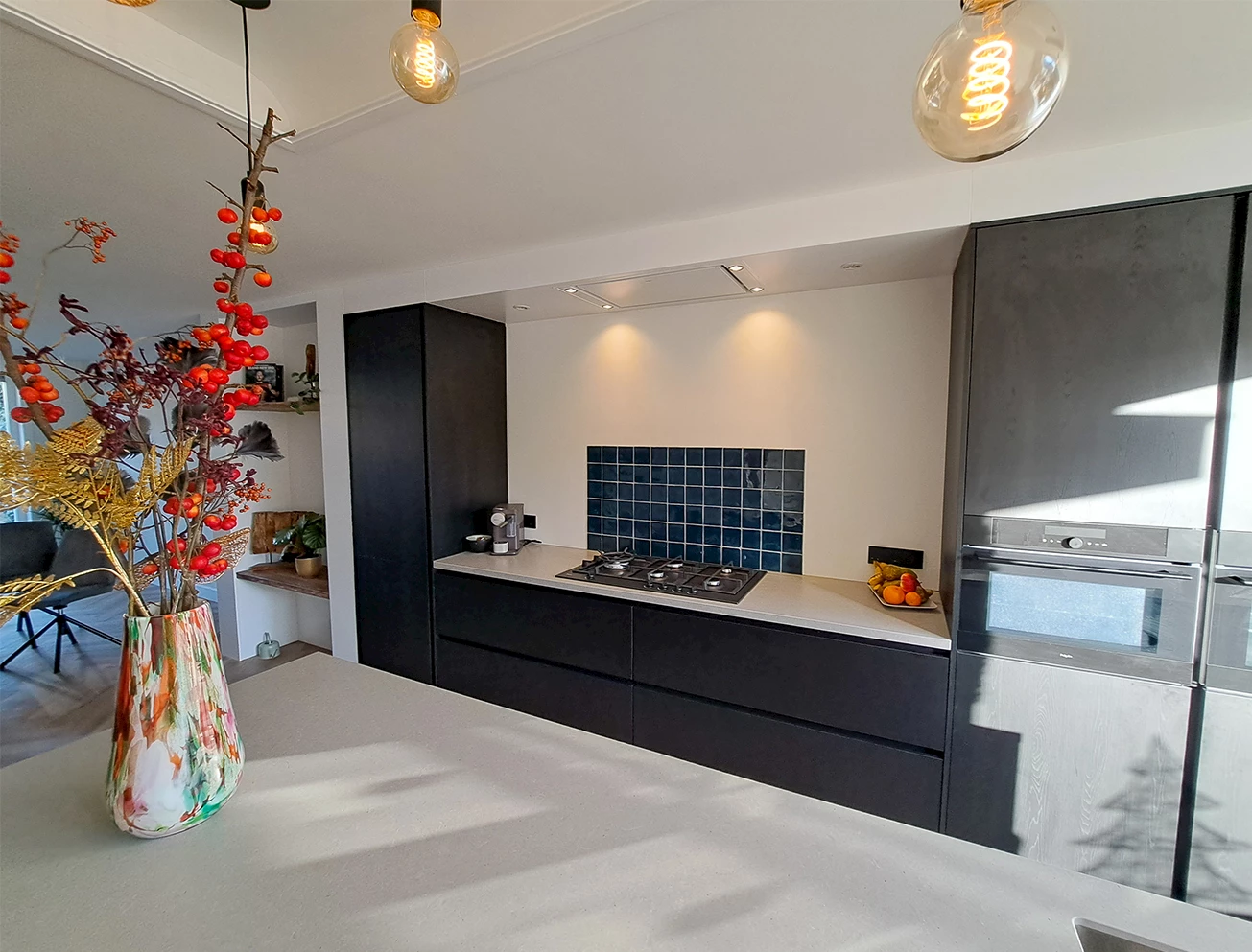 De lichtinval in deze ruimte zorgt voor de lichte uitstraling van de keuken. Maar daarnaast speelt ook de kleurkeuze en -combinatie een belangrijke rol. De familie heeft gekozen voor zwarte fronten met een houtstructuur en gecombineerd met een composieten werkblad in de kleur Easy Clay Honed. De lichte kleur van het werkblad zorgt voor een mooi contrast. Daarnaast is de ombouw om de kastenwand en de rest van de wanden wit, wat ook bijdraagt aan de lichte uitstraling.