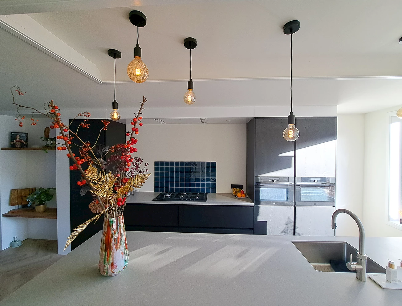 Samen met Kitchen4All Harderwijk heeft deze familie uit Bunschoten deze ruime zwarte keuken gerealiseerd. In deze ruimte kun je goed zien dat een zwarte keuken niet hoeft te betekenen dat de gehele ruimte donker oogt.