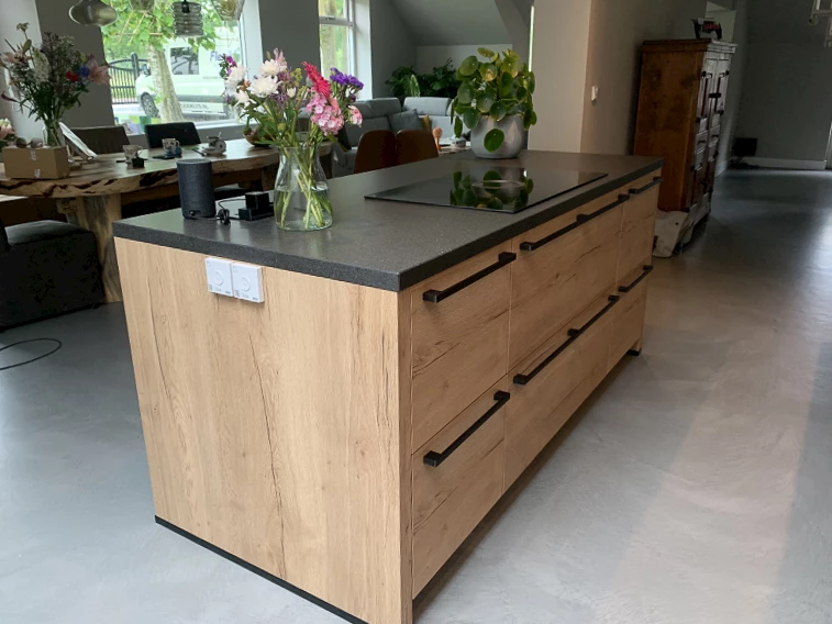 Houten keukens staan bekend om hun warme en landelijke uitstraling. Omdat hout kostbaar is, wordt er vaak gekozen voor houtlook. Dit is een imitatiemateriaal dat dezelfde landelijke uitstraling heeft als hout, maar minder kostbaar is. Je kunt een houtlook keuken op verschillende manieren creëren. Zo kun je kiezen voor houtlook fronten en deze combineren met een ander materiaal werkblad. Maar je hebt ook verschillende soorten houtlook werkbladen. Je kunt deze natuurlijk combineren met houtlook fronten, maar dit kan erg druk ogen. Een combinatie met bijvoorbeeld zwarte of grijze fronten zorgt ervoor dat de landelijke uitstraling van het houtlook behouden blijft, zonder dat het te druk wordt. Deze familie heeft gekozen voor houtlook fronten in de kleur Decor eiken Sierra in combinatie met een granieten werkblad.