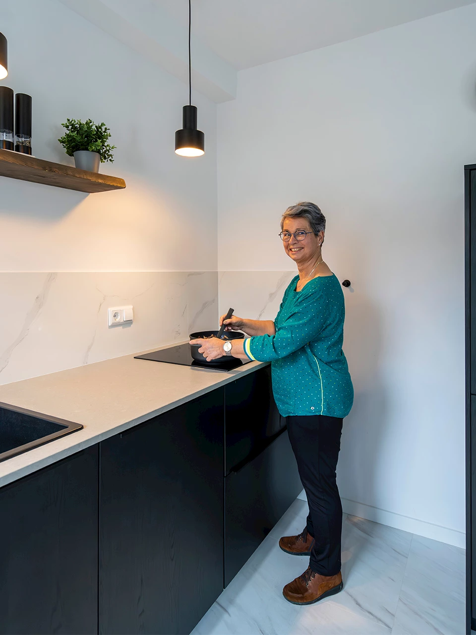 De opstelling van deze keuken lijkt op het eerste oog vrij standaard, maar wanneer je beter kijkt vallen er toch wat dingen op. Waar er bijvoorbeeld vaak gekozen wordt voor een hoge kastenwand, heeft de familie Hermsen gekozen voor een halfhoge kastenwand. Dit zorgt ervoor dat de keuken wat ruimer en lichter oog, wat fijn is wanneer je voor donkere fronten kiest. In de lage kastenwand is daarnaast een apothekerskast geplaatst, welke niet alleen erg praktisch is, maar ook een stijlvolle toevoeging aan het geheel is. Daarnaast zie je dat wanneer je voor een L-keuken kiest, je de delen niet aan elkaar hoeft te plaatsen en je dus mogelijkheden hebt.