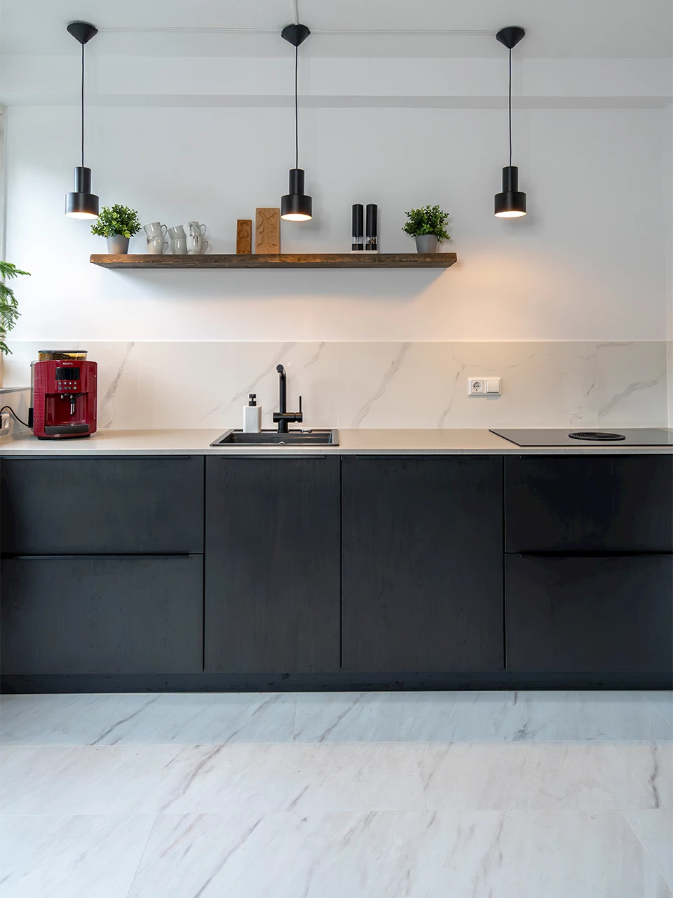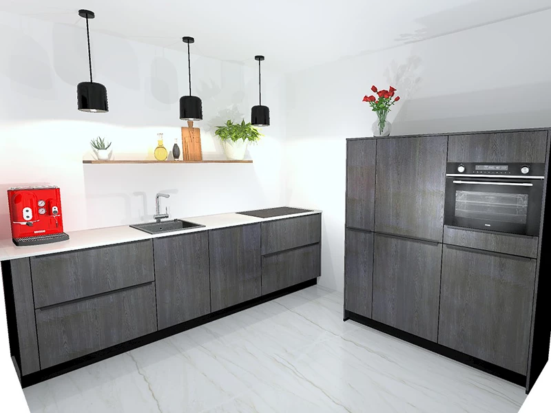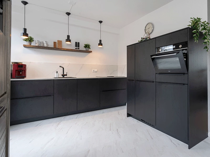 De moderne uitstraling van de keuken ontstaat door de keuze voor zwarte elementen. Zo is de keuken voorzien van fronten in de kleur Decor Eiken Nero, welke een houtstructuur hebben. Deze fronten zijn gecombineerd met een prachtig composieten werkblad in de kleur Easy Clay Honed, wat een zachtgrijze kleur heeft. Moderne keukens worden vaak greeploos uitgevoerd, maar bij deze keuken is er gekozen voor opgeschroefde greeplijsten in een zwarte kleur. Daarnaast komt de zwarte kleur ook terug bij de kraan en spoelbak, welke de keuken helemaal afmaken.