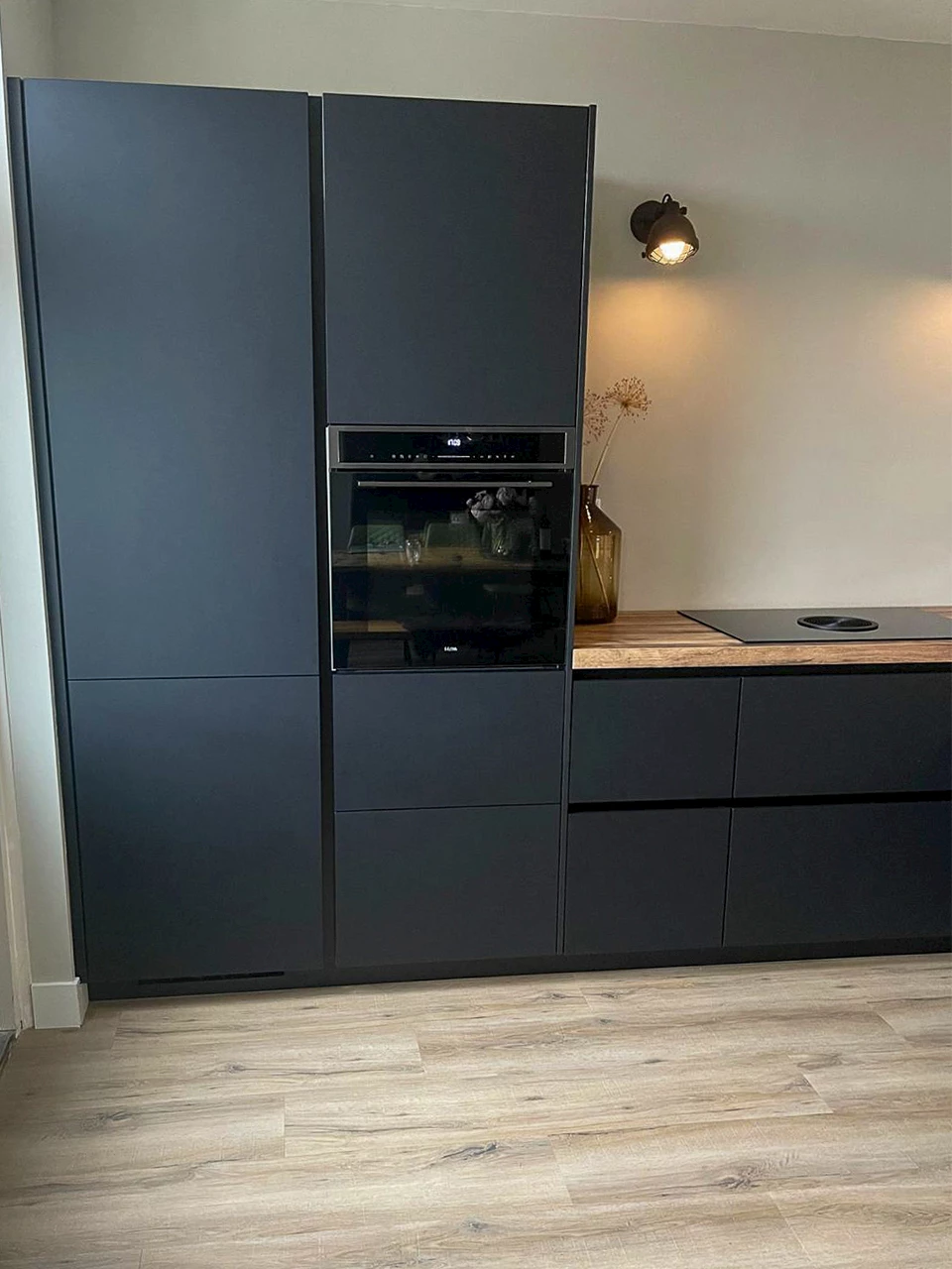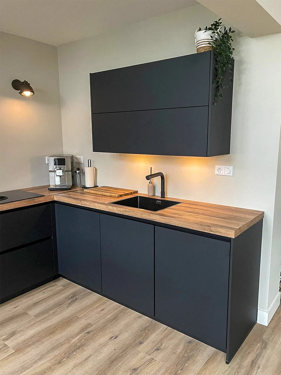 De keuken lijkt op het eerste oog echt zwart, maar is net een tintje lichter. De fronten van de keuken hebben namelijk de kleur Grafietzwart. Dit is een kleur die net wat lichter is dan echt zwart. De kleur is daardoor wat zachter en warmer, wat goed past bij een landelijke keuken. De grafietzwarte fronten zijn gecombineerd met een kunststoffen werkblad in de kleur Quiet Oak. Dit is een prachtige warme houtlook en geeft de keuken de landelijke stijl. Welke elementen wel echt een zwarte kleur hebben, zijn de spoelbak en de kokendwaterkraan. Deze zijn beide mat zwart en combineren goed bij de grafietzwarte fronten.