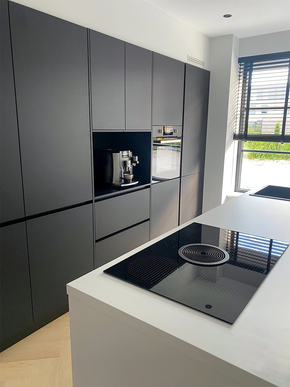 Deze keukenopstelling bestaat uit een hoge kastenwand in combinatie met een kookeiland. Waar er vaak gekozen wordt voor één kleur fronten, heeft deze familie ervoor gekozen om de kastenwand een andere kleur te geven dan het kookeiland. De fronten van de kastenwand hebben de kleur grafietzwart ultramat, welke gecombineerd zijn met de Alpin White fronten van het eiland. Een mooie, contrasterende combinatie die voor een luxe en moderne uitstraling zorgt. De zwarte kleur van de kastenwand zie je wel terugkomen in het kookeiland, de kokendwaterkaan en de spoelbak hebben beide een zwarte kleur.