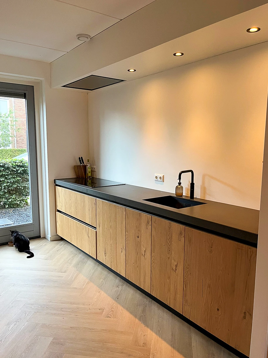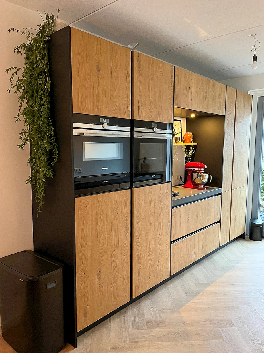 De familie Koorn heeft gekozen voor prachtige houtlook fronten in de kleur Old Forest Oak Brushed. Deze zijn gecombineerd met het composieten werkblad in de kleur Raven Honed. Gekozen is voor een semi-greeploze keuken met greeplijsten, hierdoor krijgt deze landelijke keuken een moderne uitstraling. De kraan en spoelbak hebben een zwarte kleur en passen daardoor perfect bij het donkere werkblad. De familie heeft gekozen voor een onderbouw spoelbak, hierbij wordt de spoelbak onder het werkblad geplaatst. Dit zorgt voor een strak geheel! Alle apparatuur, waaronder de oven met stoomfunctie en warmhoudlade, is van het merk Siemens. Boven de kookplaat is een plafondunit geplaatst, waardoor de afzuigkap netjes is weggewerkt.