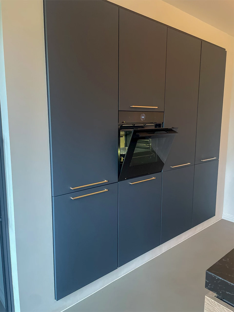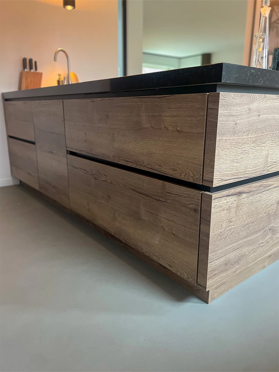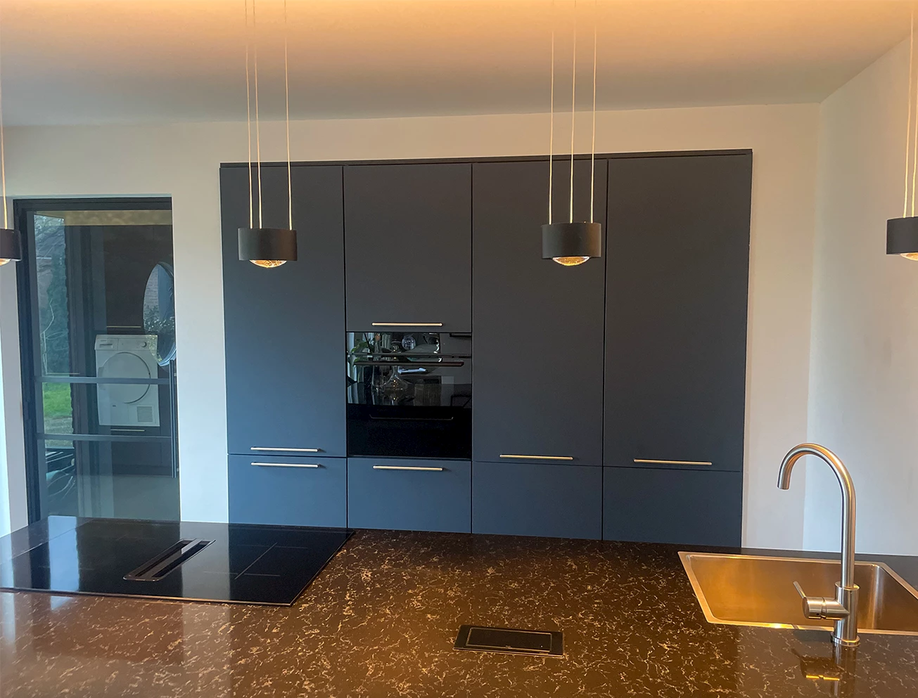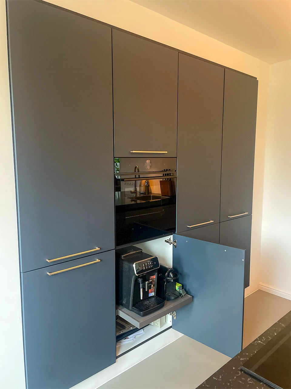In deze keuken is aan ieder detail gedacht. Het eiland is voorzien van zwarte greeplijsten, wat goed past bij de donkere kleur van het werkblad. Voor de kastenwand is gekozen voor rvs-grepen, welke prachtig combineren bij de rvs-spoelbak en kraan. Een ander uniek detail in deze keuken is de manier waarop het koffieapparaat is ingebouwd. Een van de kasten in de kastenwand is voorzien van een uittrekplateau, waar het koffieapparaat op staat. Zo staat deze niet in het zicht, maar kun je er altijd eenvoudig bij!