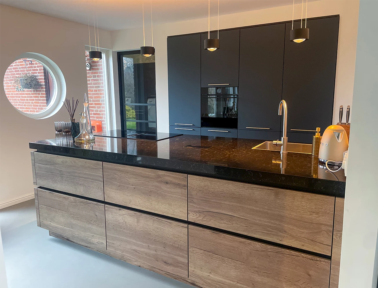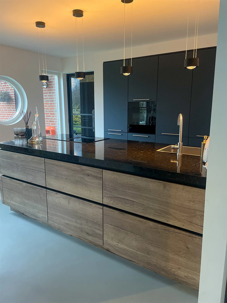 Deze keuken heeft een stijlvolle en luxe look, welke ontstaat door de originele combinatie van kleuren en materialen. De familie Oving heeft gekozen voor twee verschillende fronten, de hoge kastenwand is voorzien van fronten in de kleur Fjordblauw en het eiland van houtlook fronten. Het marmerlook werkblad is van composiet en heeft een prachtige donkere kleur. De combinatie van kleur, contrast en natuurlijke materialen is gewaagd, maar zeer stijlvol.