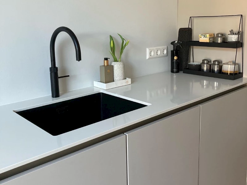 Composieten werkbladen worden geproduceerd door kleine stukjes beton, graniet of marmer te mixen met bindend hars en pigment. Dit mengsel wordt onder hoge druk geperst waardoor er een sterk materiaal ontstaat. Composiet is sterker dan natuursteen, maar heeft wel dezelfde natuurlijke en robuuste uitstraling. Je hoeft dus ook minder voorzichtig te zijn met composiet dan met natuursteen. De familie Smit heeft gekozen voor composieten werkbladen in de kleur Easy Clay Honed. Dit is een zachte kleur, waardoor de werkbladen een natuurlijke uitstraling hebben.