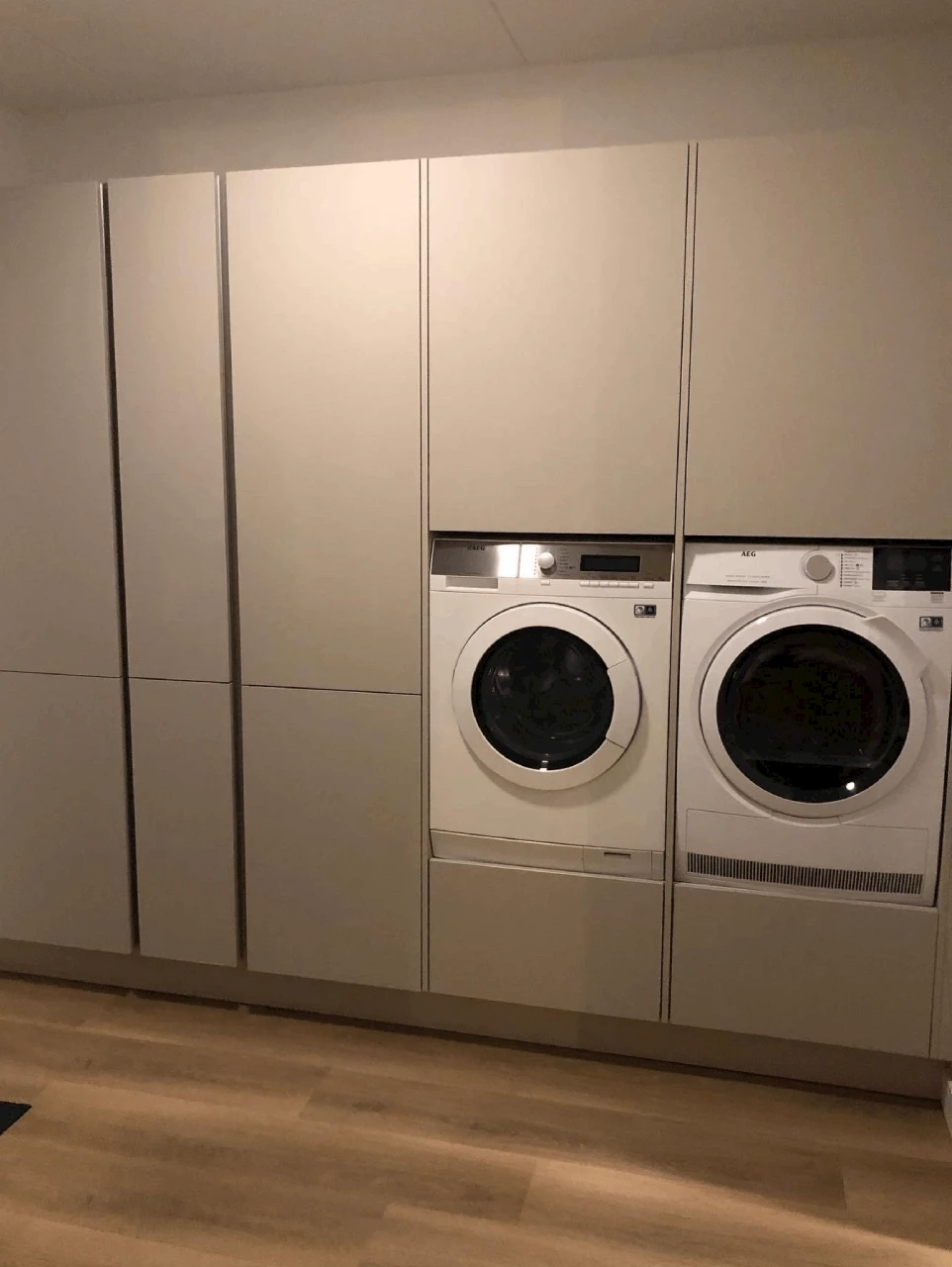 Naast een keuken heeft familie Smit ook een bijkeuken samengesteld. Deze bijkeuken heeft dezelfde zandkleurige fronten als de keuken, wat voor eenheid zorgt. Om voor optimaal comfort te zorgen is de bijkeuken voorzien van ruimte voor de wasmachine en droger.