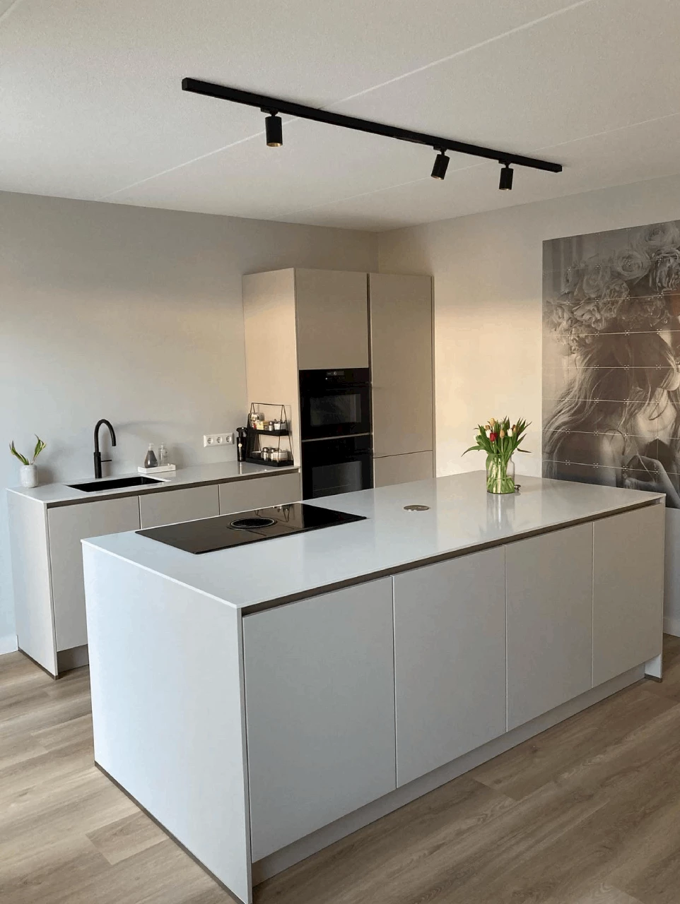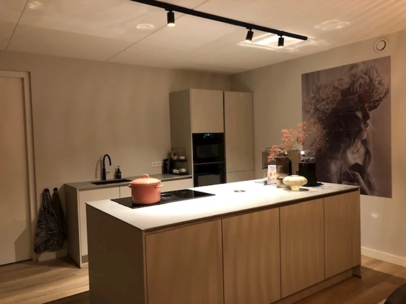 Deze familie heeft gekozen voor fronten in de kleur Zand. Deze fronten hebben een ultramatte afwerking. De fronten zijn gecombineerd met composieten werkbladen in de kleur Easy Clay Honed. Deze combinatie zorgt ervoor dat de keuken een moderne, maar toch natuurlijke uitstraling heeft. De opstelling van de keuken bestaat uit een rechte keuken in combinatie met een kookeiland. Het kookeiland creëert extra werk- en opbergruimte. Zo heb je alle ruimte om samen, of alleen te koken! De moderne uitstraling van de keuken wordt versterkt door de zwarte spoelbak en de zwarte kokend waterkraan van Quooker. De apparatuur van de keuken bestaat uit een inductiekookplaat met geïntegreerde afzuiging, een stoomoven en een oven met magnetronfunctie. Een keuken voor een echte kookliefhebber!