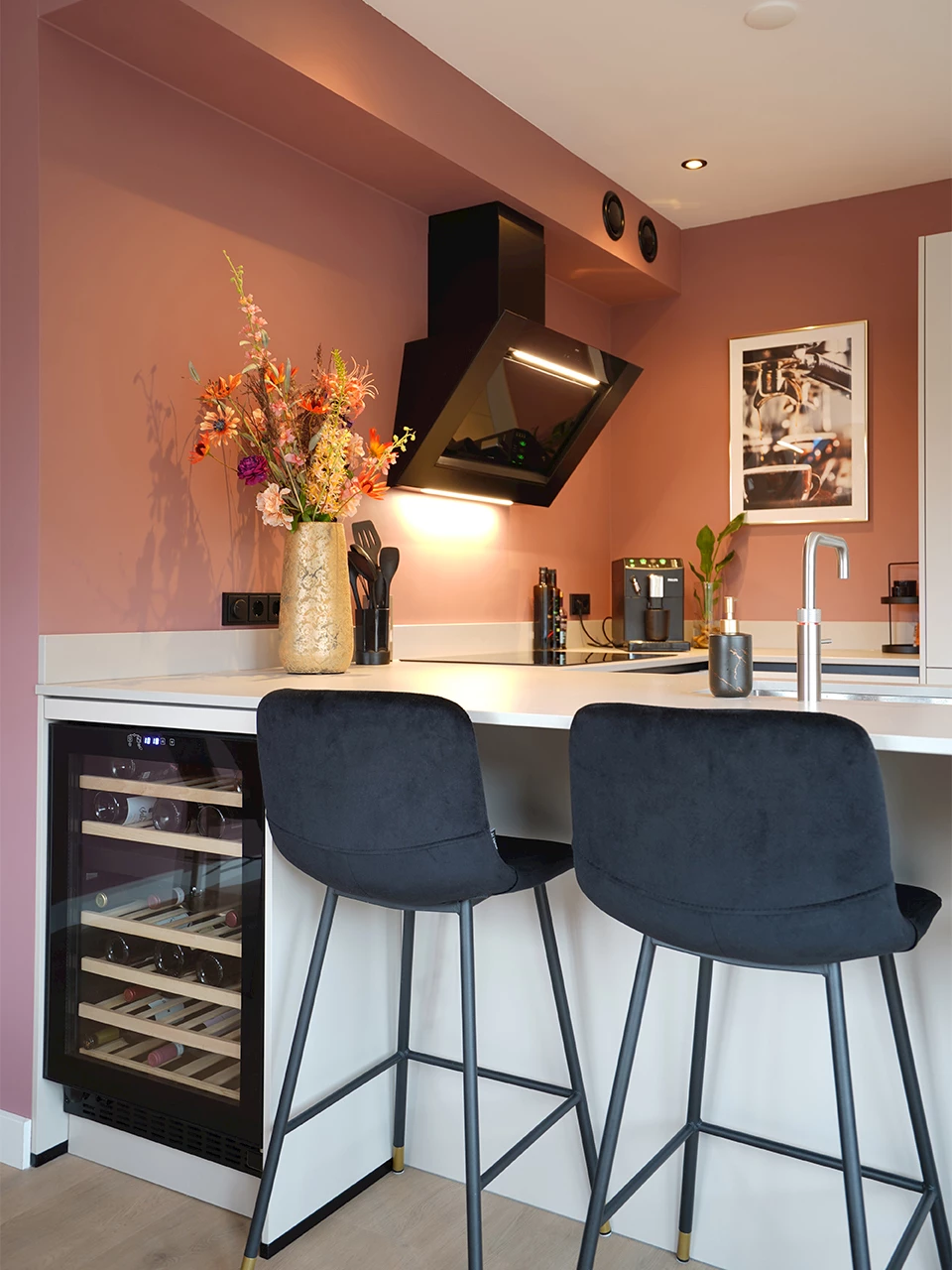 De roze wanden in de ruimte zullen je ongetwijfeld niet ontgaan zijn. Door te kiezen voor een lichte keuken, ontstaat er een prachtig modern chique geheel met een pop of collor. Die moderne chique uitstraling van deze keuken wordt gecreëerd door de zandkleurige fronten welke gecombineerd zijn met een composieten werkblad in de kleur Brume Velvet. Om die uitstraling te versterken is er gekozen voor zwarte greeplijsten. De kraan en spoelbak mogen natuurlijk niet ontbreken, om de rustige sfeer van de keuken te behouden, heeft de familie gekozen voor een rvs-spoelbak en -kraan.