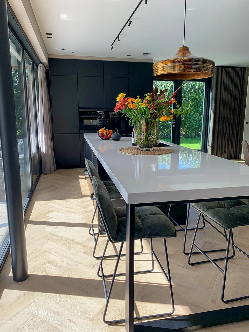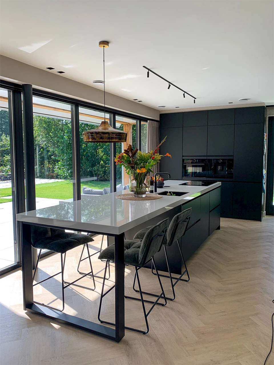 De volledige keuken is voorzien van prachtige donkere fronten in de kleur Zwart Supermat. De fronten hebben dus een hele matte finish, wat voor een luxe uitstraling zorgt. Dit is gecombineerd met een composieten werkblad in de kleur Easy White. Het zwart van de fronten komt ook terug in de kraan en de spoelbak, beide hebben een zwarte kleur. Hierdoor ontstaat er eenheid in de keuken en blijft de moderne sfeer behouden. De keuze voor volledig zwarte apparatuur maakt deze luxe en moderne keuken helemaal af.