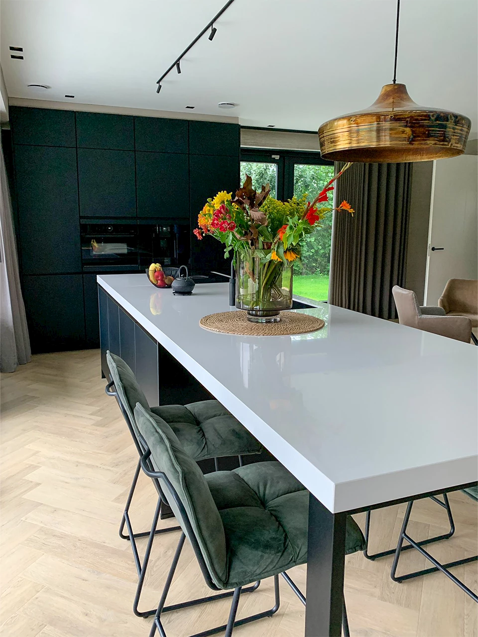 De familie heeft gekozen voor een open woonkeuken. De keukenopstelling bestaat uit een hoge kastenwand en een ruim kookeiland met keukenbar met vier zitplekken. Er kan dus gezellig gedineerd worden aan de keukenbar. Het voordeel van de hoge kastenwand is natuurlijk dat er veel extra opbergruimte wordt gecreƫerd. Maar het brengt nog een voordeel met zich mee, de oven en het koffieapparaat zijn namelijk op armhoogte ingebouwd. Zo kun je er altijd goed bij en hoef je niet te bukken.