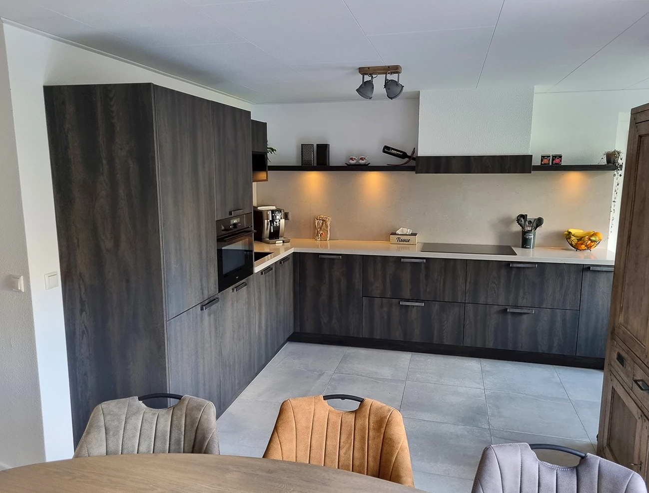 Kitchen4All Dronten heeft deze keuken opgeleverd bij de familie van Loo uit Wezep. De unieke donkere fronten in combinatie met het lichte werkblad zorgen voor de robuuste sfeer en uitstraling van de keuken.