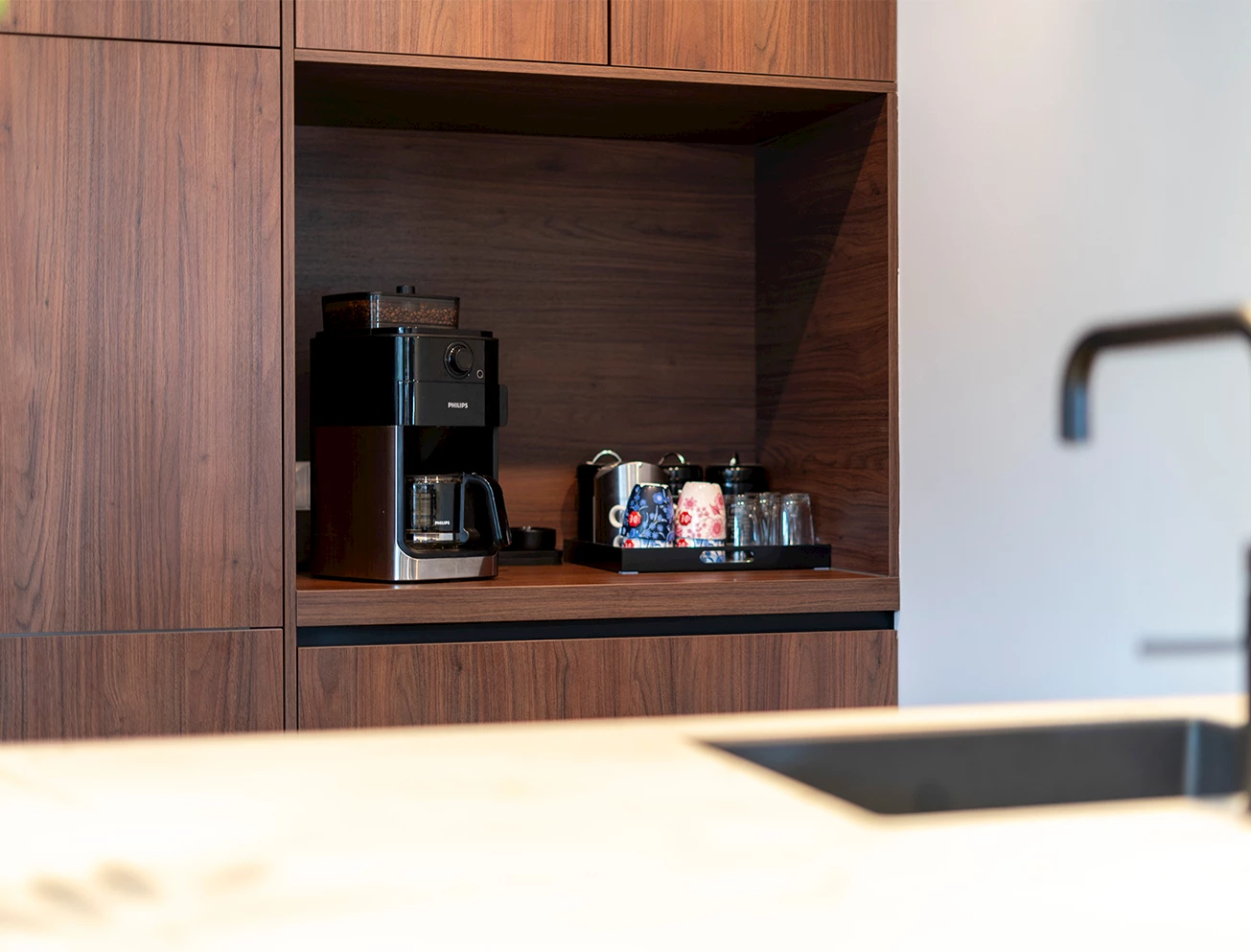 Door de ruim opgezette keukenopstelling is er alle ruimte om samen te kunnen koken. Bovendien biedt de hoge kastenwand ook meer dan voldoende opbergplek voor al het keukengerei. Maar ook aan geschikte apparatuur ontbreekt het in deze keuken niet. In de kastenwand zijn een luxe oven, combi-oven en een ruime koelkast geplaatst. En wanneer je van koken houdt, wil je daar vaak ook graag een lekker wijntje bij. De wijnklimaatkast kon dan ook niet ontbreken in de keuken van de familie Vial.