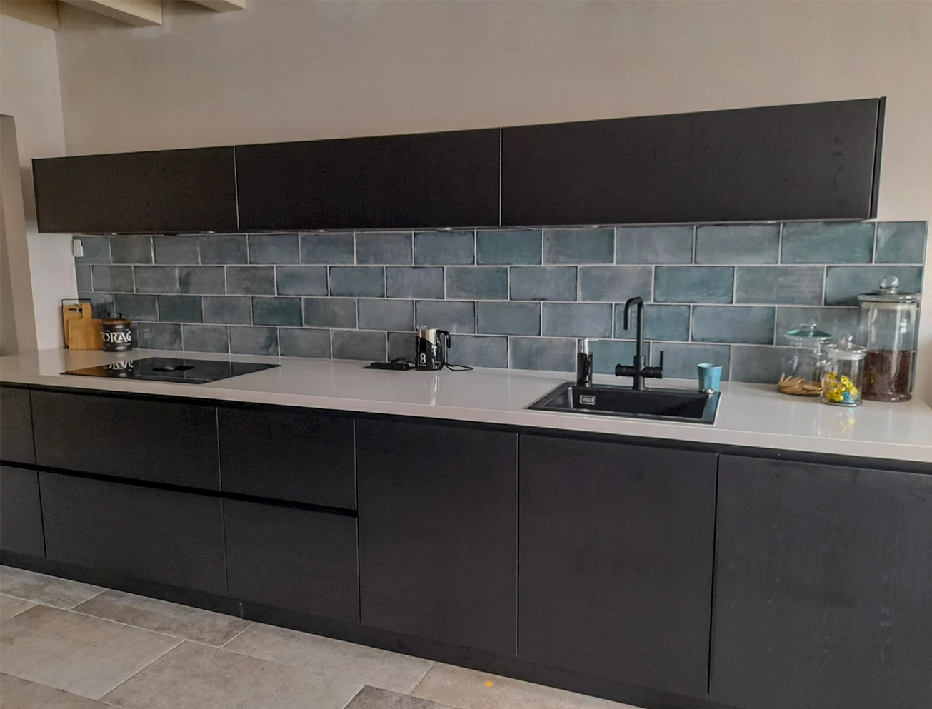 De volledige opstelling is voorzien van fronten in de kleur Decor Eiken Nero. De fronten hebben een houtlook, wat goed past bij de landelijke stijl van de keuken. Op het lage deel van de keuken is een prachtig composieten werkblad in de kleur Epic White. Dit vormt een mooi contrast met de donkere fronten en zorgt ervoor dat de keuken niet donker oogt. Het zwart van de fronten komt terug in de kraan en de spoelbak. Beide hebben een mat zwarte kleur. De blauwe tegels heeft de familie zelf aan de keuken toegevoegd en zorgen voor een prachtige kleurrijke touch.
