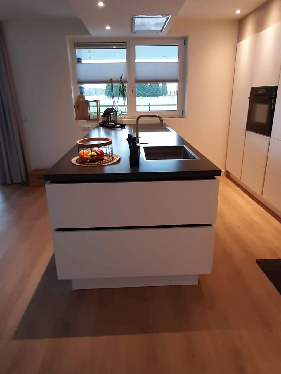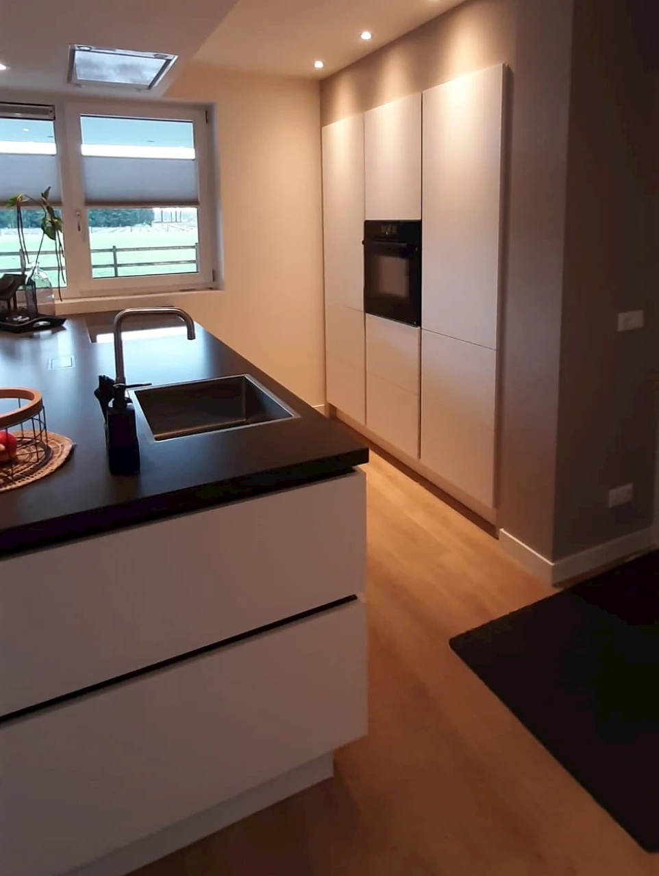 Deze familie heeft gekozen voor een zwart witte keuken, welke bestaat uit een kookeiland met twee kastenwanden. Het eiland creëert een ruime werkplek en zorgt er daarnaast voor dat er een open ruimte ontstaat. Er is voor het eiland een combinatie gemaakt van mat witte fronten en een werkblad in de kleur Easy Rock Velvet. Ook beide kastenwanden hebben mat witte fronten. De zwarte kleur van het werkblad komt terug in de greeplijsten; ook deze zijn zwart. Doordat de keuken is voorzien van greeplijsten, krijgt de keuken een moderne uitstraling. De koelkast en de vaatwasser zijn voorzien van paneeldeuren waardoor deze zijn mooi strak weggewerkt. Deze keuze versterkt de moderne uitstraling van de keuken. Ook de kookplaat is netjes weggewerkt; in het werkblad is een uitsnede gemaakt waardoor de kookplaat gelijkligt met het werkblad. Boven de kookplaat hangt een plafondunit afzuigkap. Doordat deze units aan het plafond worden bevestigd zijn deze ideaal voor kookeilanden. Voor het optimale comfort is er gekozen voor een kokend waterkraan van Selsiuz. Met een kokend waterkraan heb je direct kokend water uit de kraan, zodat je letterlijk in een handomdraai verse thee op tafel kan zetten. Wel zo handig!