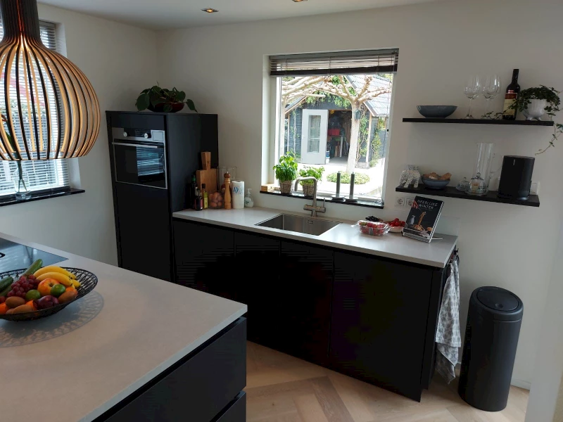 Zwarte keukens zijn de trend op dit moment. Als je bang bent dat een zwarte keuken saai en somber is, bewijst deze keuken dat dit absoluut niet het geval hoeft te zijn. Door een slimme opstelling, mooie materialen en luxe apparaten is er een fijne leefkeuken gecreëerd. Deze keuken is gekocht bij Kitchen4All Doetinchem. Niet alleen wij vinden dit een prachtige keuken geworden, ook de familie geniet volop van de ruimte.