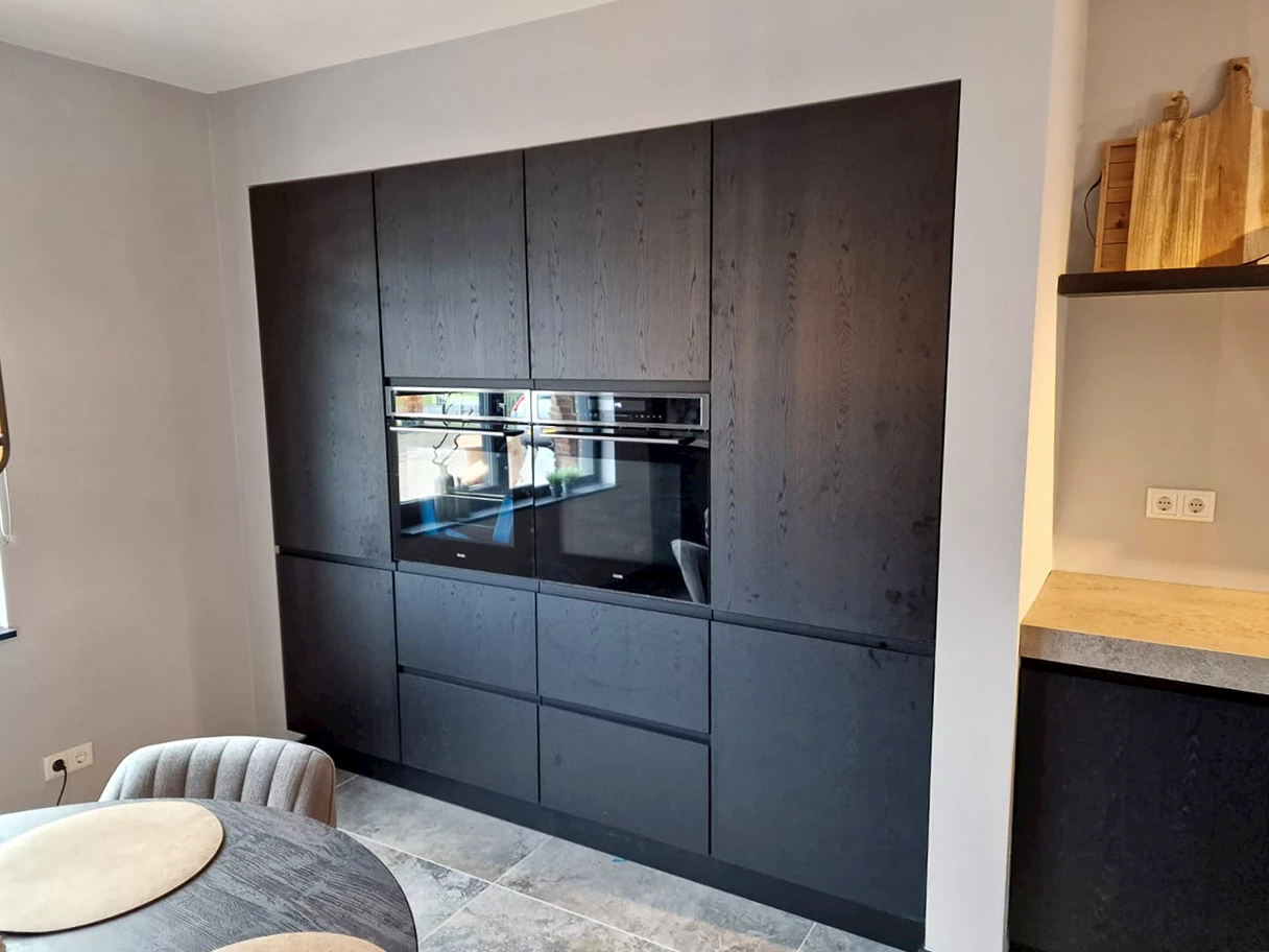 De familie heeft gekozen voor een ruime keukenopstelling bestaande uit een recht keukenblok, een kookeiland én een kastenwand. De kastenwand is ingebouwd, wat de moderne uitstraling van de ruimte versterkt. Voor de volledige keuken is er gekozen voor fronten in de kleur Decor eiken Nero. Deze fronten zijn voorzien van een hout structuur, wat zorgt voor een robuust tintje. De fronten zijn gecombineerd met een betonlook werkblad. Vaak zien we dat er bij een zwarte keuken gekozen wordt voor een zwarte spoelbak en kraan. Deze familie heeft gekozen voor een rvs spoelbak en een zwarte Quooker, wat een prachtige combinatie is.