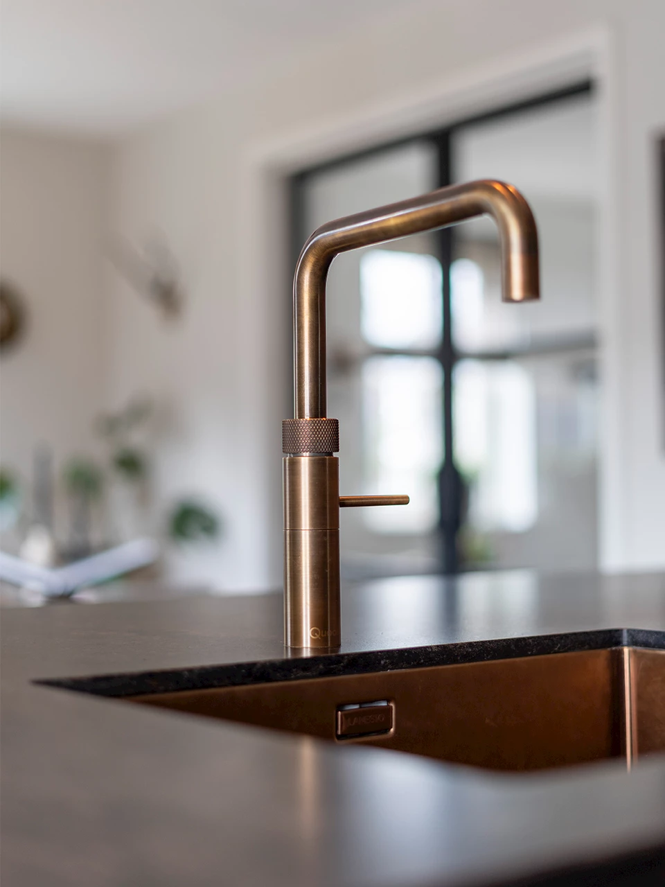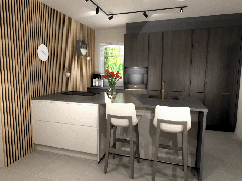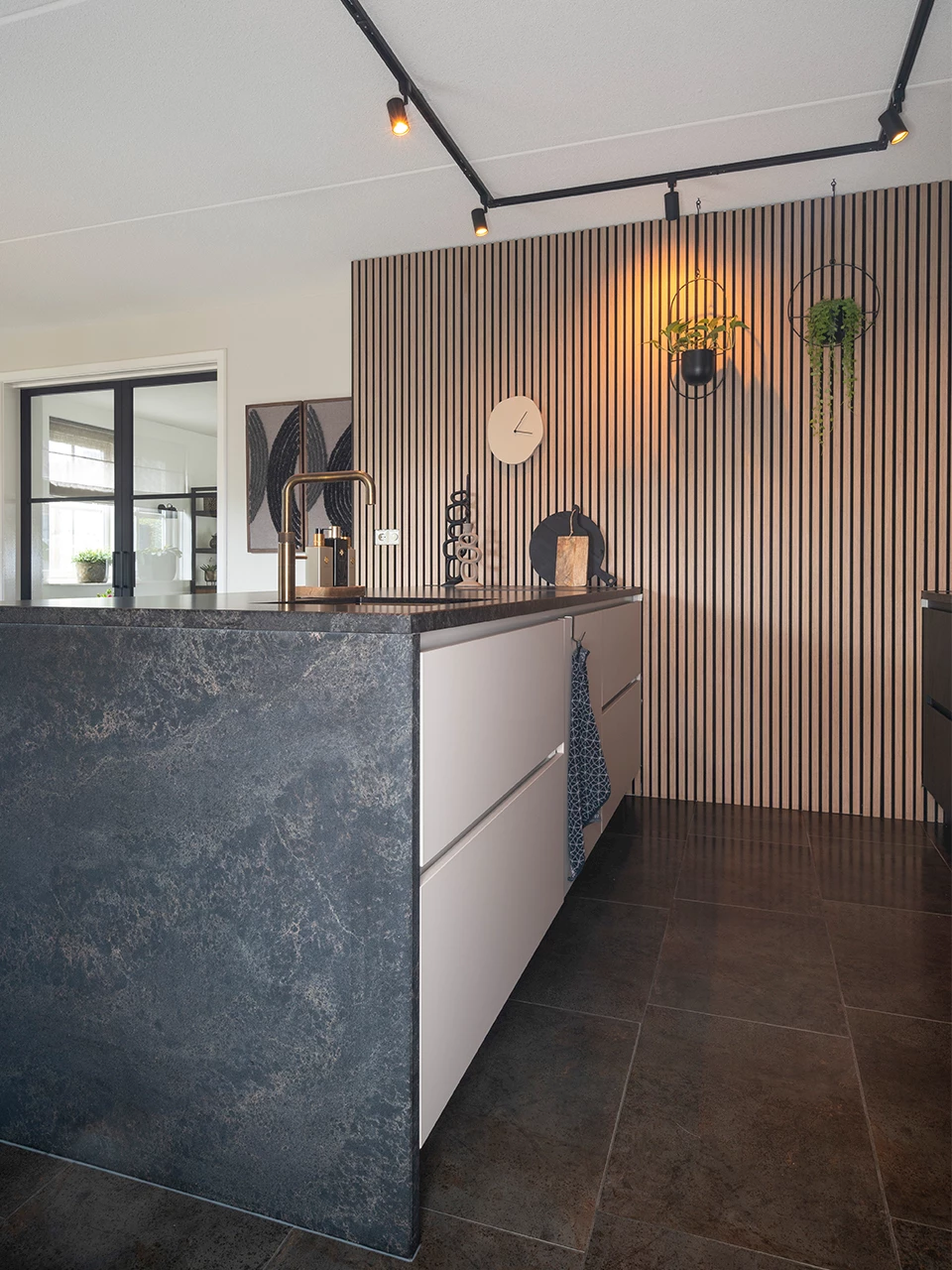 De familie heeft in deze keuken niet alleen gekozen voor donkere kleuren, maar een contrast gemaakt van licht en donker. De hoge kastenwand is voorzien van fronten in de kleur Wild Eiken Zwart. Deze zwarte fronten hebben dus een houtlook, wat de design uitstraling van de keuken nog eens versterkt. Het schiereiland is voorzien van fronten met een hele lichte kleur, namelijk Zand Ultramat. Op beide delen is een composieten werkblad in de kleur Darcrest Satin geplaatst, wat een prachtig marmerlook blad is. De koperkleurige kokendwaterkraan en spoelbak maken dit geheel helemaal af.
