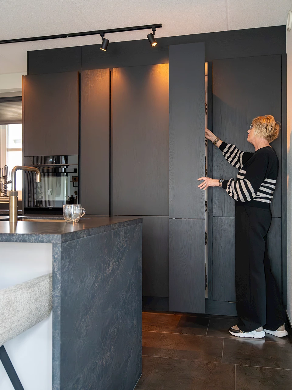 Deze prachtige keuken is opgeleverd door Kitchen4All Hoogeveen bij de familie Giethoorn. Zij hebben gekozen voor een combinatie van donkere kleuren en koperkleurige accenten, wat deze design keuken een warme uitstraling geeft.
