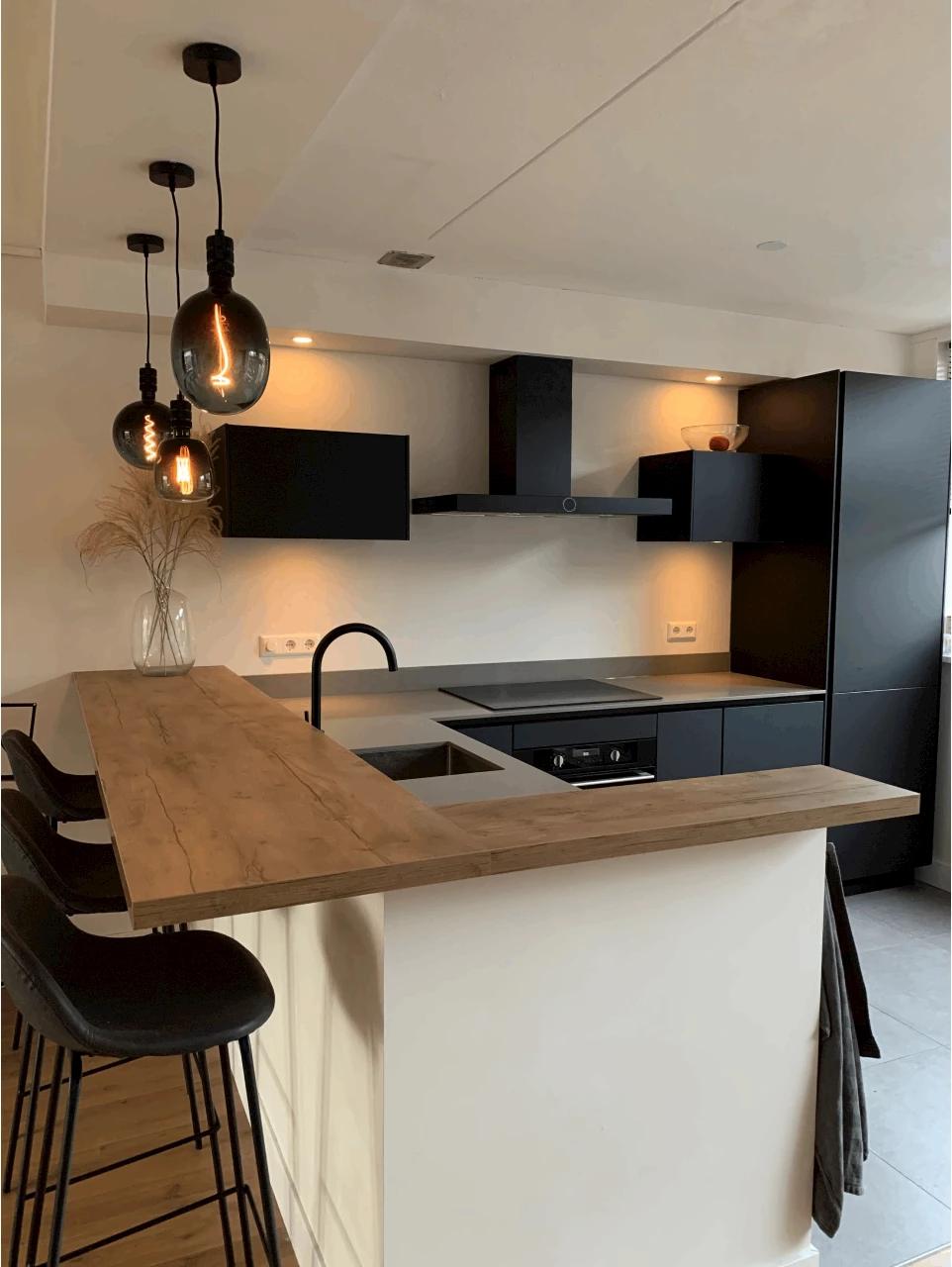 De keuken bestaat uit fronten in de kleur supermat zwart en hebben dus een extra matte finish. De fronten zijn voorzien van greeplijsten, dit zorgt voor een strakke en moderne uitstraling. Er is een combinatie gemaakt tussen twee soorten werkbladen: het werkblad van de keukenbar heeft de kleur natuureiken, het andere werkblad heeft een betonlook. Deze combinatie vormt een mooi contrast met de mat zwarte fronten van de keuken. De strakke uitstraling van de keuken wordt versterkt door de wasbak en de kookplaat, bij beide is er een uitsparing gemaakt waardoor ze dieper in het werkblad liggen. De koel-vriescombinatie en de vaatwasser zijn voorzien van een paneeldeur waardoor ze netjes weggewerkt zijn. Om extra sfeer te creëren heeft deze familie gekozen voor geïntegreerde ledverlichting. Naast extra sfeer, zorgt dit natuurlijk ook voor extra licht tijdens het koken.