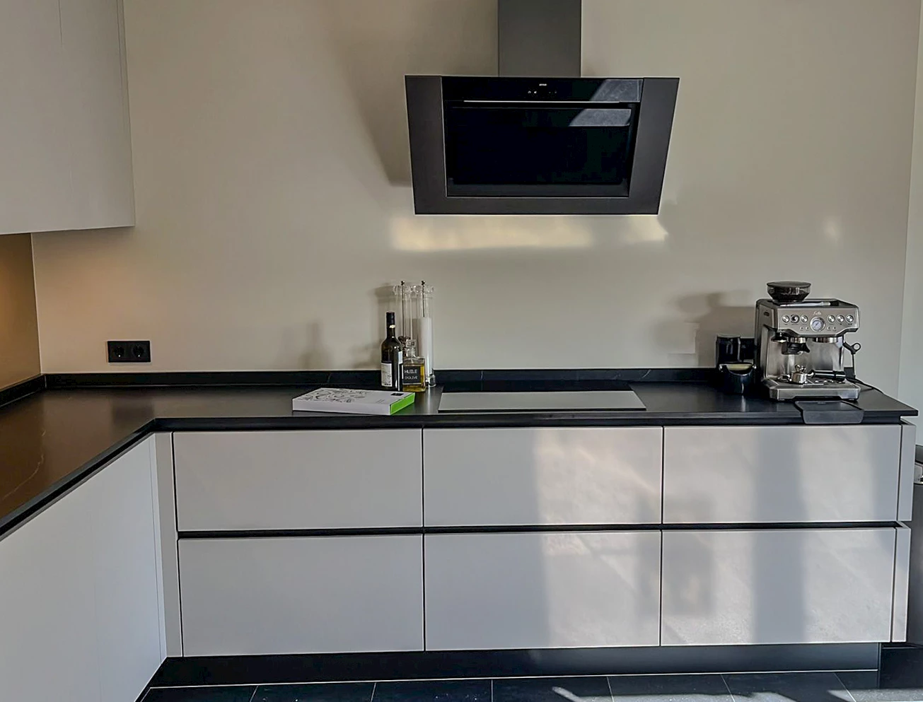 In deze keuken is er gekozen voor fronten in de kleur Zand ultramat. Dit is dus een zandkleur met een matte afwerking. De zandkleurige fronten zijn gecombineerd met een composieten werkblad in de kleur Charcoal Marble Velvet. Het is een marmerlook werkblad voorzien van een lichte ader, deze past goed bij de lichte fronten. De donkere kleur van het werkblad komt terug in de greeplijsten, waar voor mat zwart is gekozen. Daarnaast zijn de plinten van de keuken ook zwart, een prachtige keuze die we niet vaak zien. Om het geheel af te maken is er een mat zwarte kraan en spoelbak geplaatst.