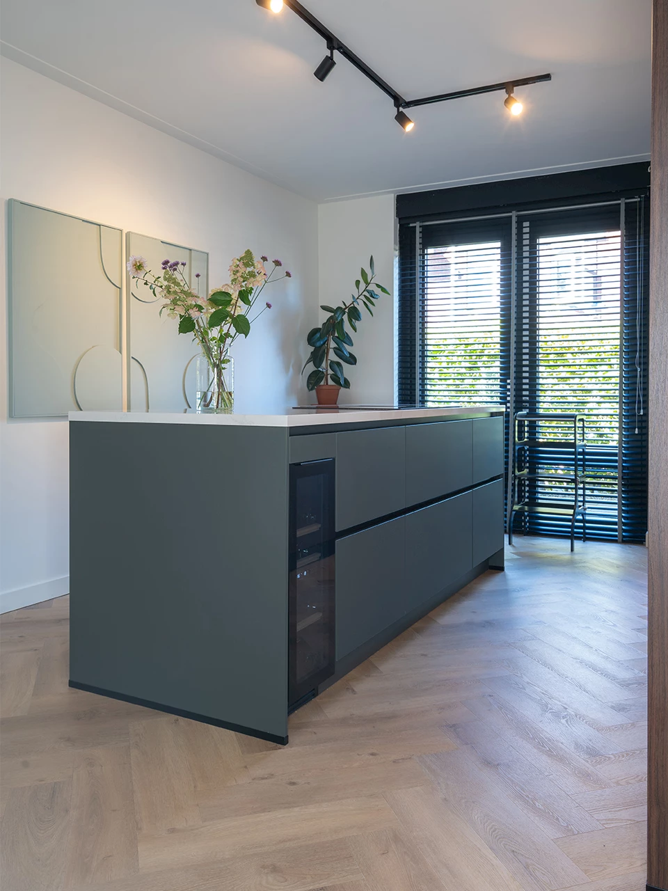 Niet iedereen durft voor groen te kiezen omdat het best gewaagd kan zijn. In deze keuken kun je goed zien, dat door de juiste combinaties te maken het juist erg chique en stijlvol kan zijn. Het eiland is voorzien van fronten in de kleur Mineraalgroen en zijn gecombineerd met fronten in de kleur Decor Notenhout, welke gekozen zijn voor het rechte deel. In de gehele keuken is er gekozen voor een composieten werkblad in de kleur Calacatta Gold Polished. Dit is een prachtig marmerlook werkblad met een lichte ader. De combinatie van de drie verschillende elementen geeft deze keuken de luxe en design uitstraling.