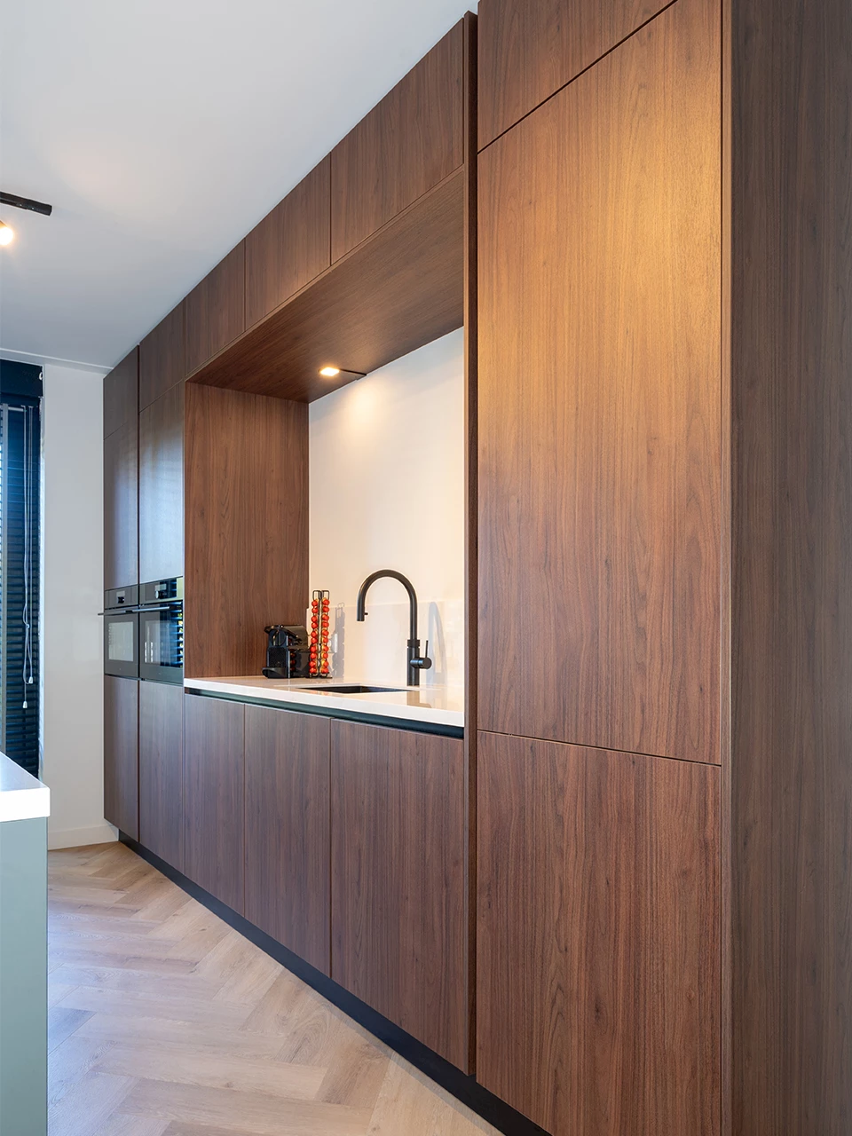 De opstelling van de keuken bestaat uit twee delen: een kookeiland en een rechte keuken. Bij het rechte deel is gekozen voor drie hoge kastenwanden, welke aan de uiteinden van de opstelling zijn geplaatst. Boven het middelste deel is er gekozen voor bovenkasten, hierdoor ontstaat een ruime nis. Ideaal voor een gezellige koffiehoek. In dit geval is er ook voor gekozen om de kraan en spoelbak er te plaatsen. Deze bevinden zich op deze manier dicht bij de kookplaat, wat vaak fijn werkt. Het eiland is naast kasten voorzien van een keukenbar, zo kunnen gasten je gezelschap houden tijdens het koken.