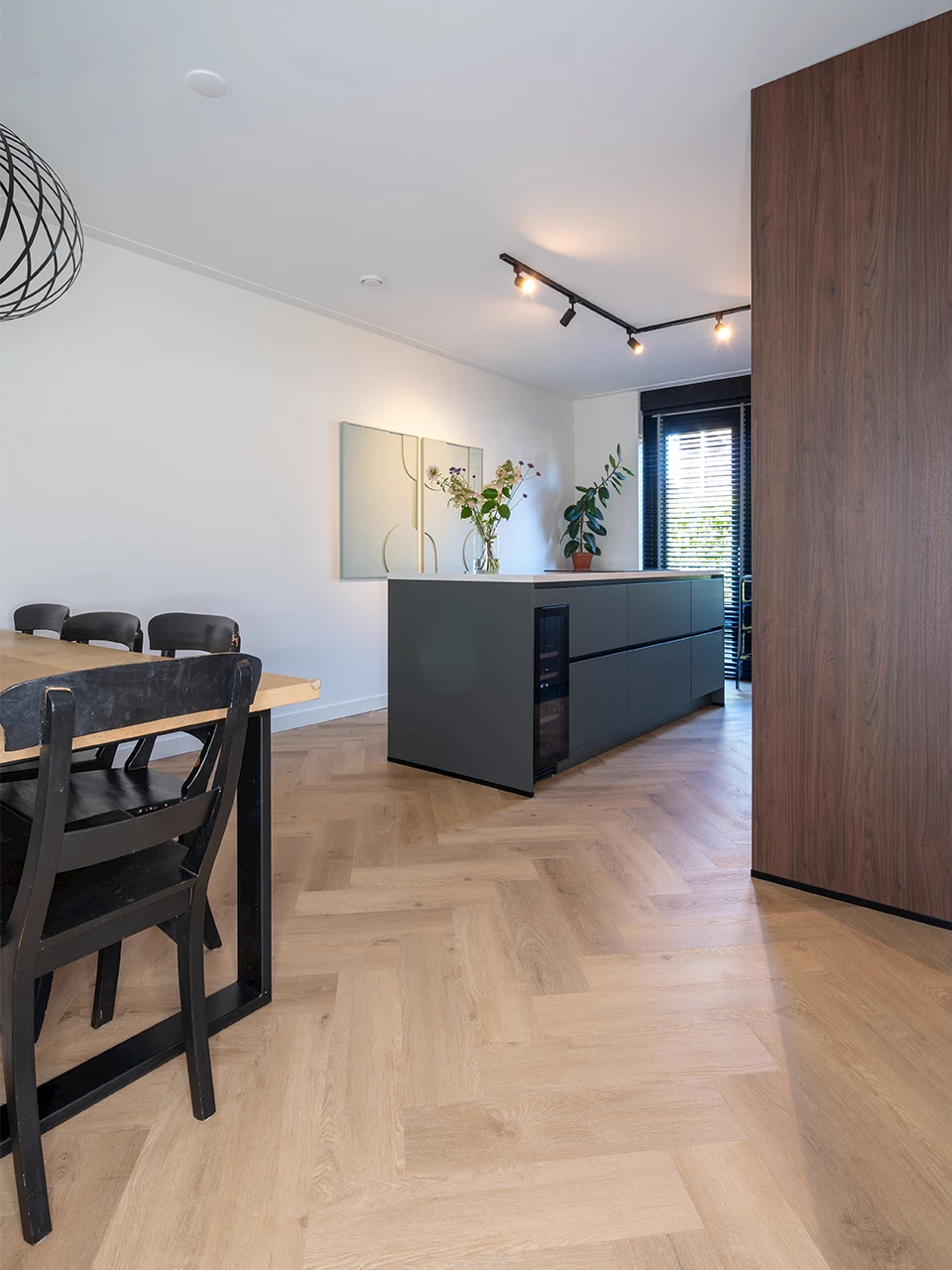 Vaak wanneer de keuken vervangen wordt, moet vaak ook de keukenvloer vervangen worden. In veel gevallen is deze namelijk beschadigd of verandert de keukenopstelling. We bieden daarom ook pvc-vloeren aan. Ook in deze keuken is er een nieuwe vloer geplaatst. Er is gekozen voor een visgraatvloer in een prachtige warme vloer. De warmte van de vloer combineert prachtig met de warme uitstraling van de notenhouten fronten. De vloer maakt het geheel echt af!