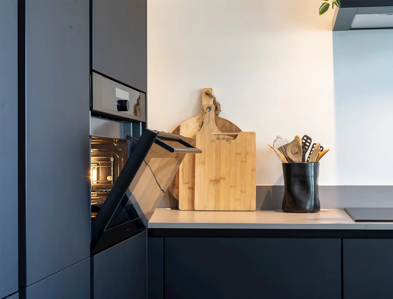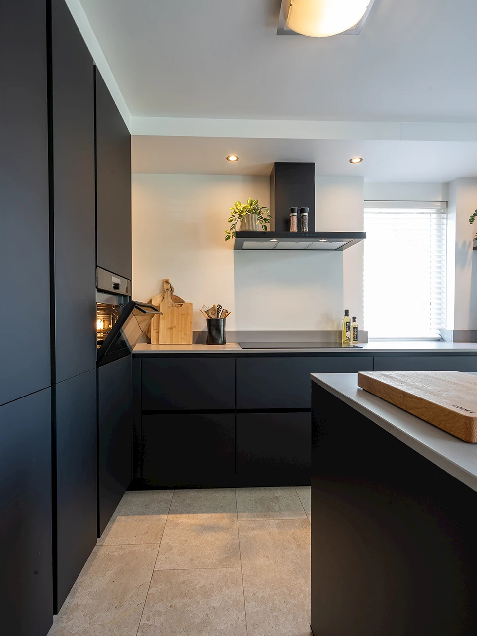 De volledige keuken is voorzien van fronten in de kleur grafietzwart ultramat en greeplijsten in de kleur zwart. Met een greeplijst geniet je van de voordelen van een greep en de strakke uitstraling van een volledig greeploze keuken. Op het L-vormige deel van de keuken is een composieten werkblad in de kleur Smoked Concrete Velvet geplaatst. De combinatie van de zwarte fronten en het betonlook werkblad geven de keuken die strakke en moderne uitstraling. De kokendwaterkraan en de spoelbak hebben beide ook een zwarte kleur en passen daardoor prachtig bij deze strakke keuken.