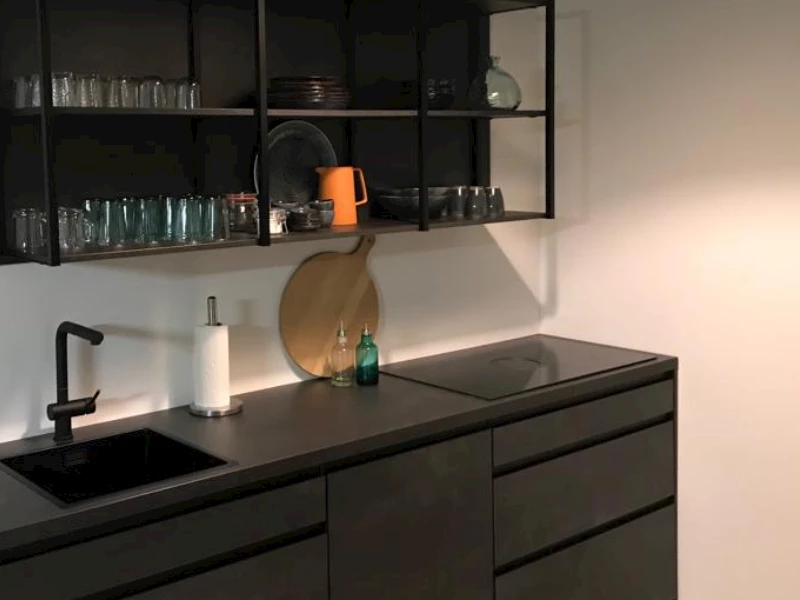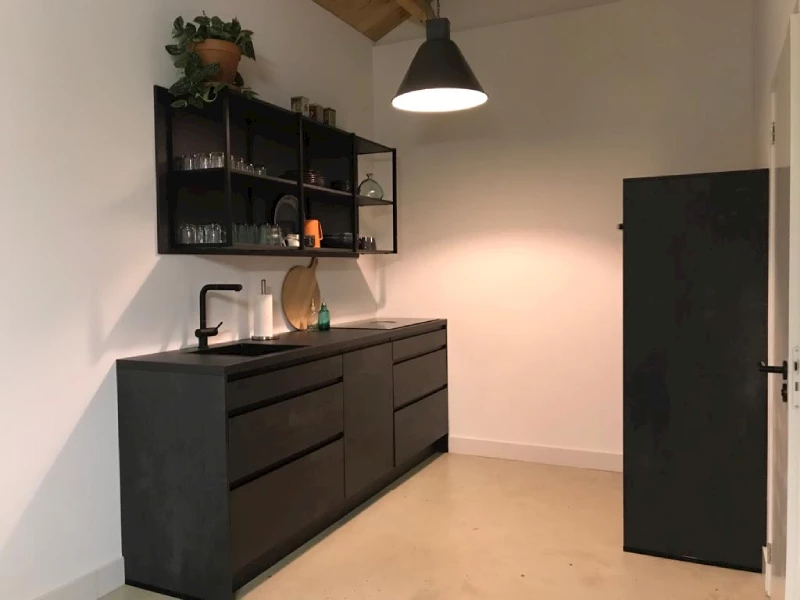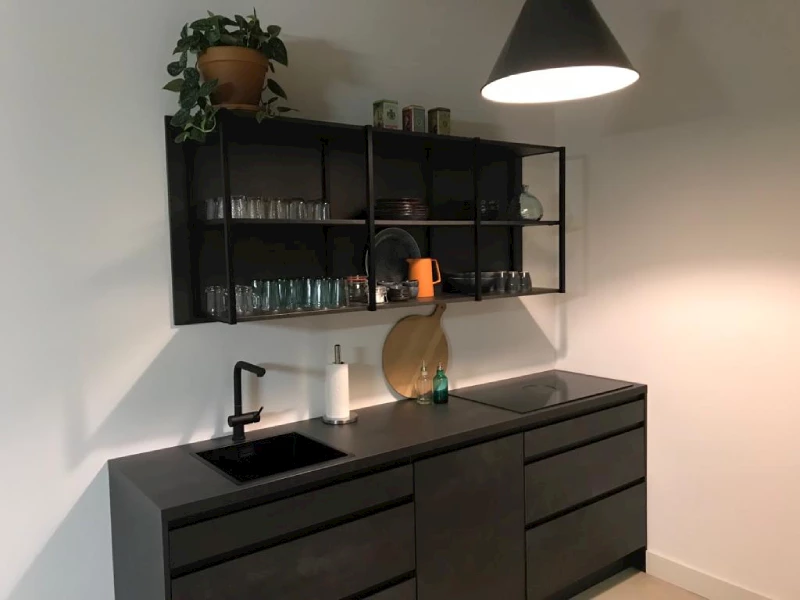 In deze keuken is er gekozen voor een opstelling van twee rechte keukens. Met deze opstelling kan je eenvoudig werk- en opbergruimte creëren. De hele keuken is voorzien van zwarte betonlook fronten. Deze fronten zijn voorzien van een betonstructuur, waardoor de keuken een extra moderne uitstraling krijgt. Op beide delen van de keuken is een kunststof werkblad in de kleur Decor leisteen geplaatst. Doordat er gebruik is gemaakt van twee verschillende structuren/materialen, ontstaat er een speels effect en oogt de keuken niet saai. De fronten van de keuken zijn voorzien van zwarte ingefreesde greeplijsten, deze versterken de moderne uitstraling van de keuken. Ook de spoelbak en de kraan hebben een zwarte kleur. In deze keuken is er door de XL-kast op een eenvoudige manier opbergruimte gecreëerd. In deze XL-kast is ook de koelkast geplaatst, welke op deze manier netjes is weggewerkt. Ditzelfde geldt voor de vaatwasmachine; deze strak weggewerkt door middel van een paneeldeur. Om de keuken te voorzien van accessoires is er gekozen voor een open-kast systeem. Je kan zo eenvoudig je mooie glazen neerzetten zonder dat deze achter een deur verdwijnen!