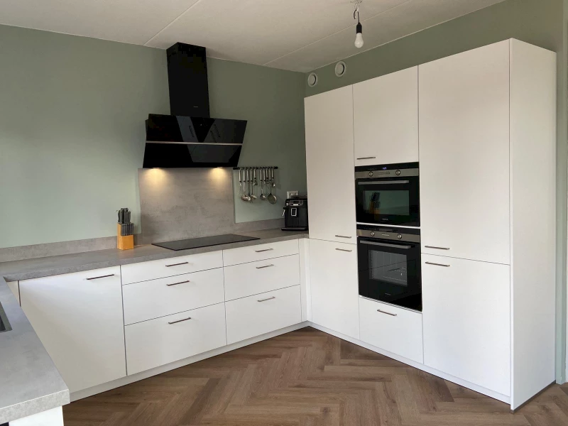 Een U-keuken heeft veel opberg- en werkruimte door het relatieve grote werkblad en de vele opberglades en kasten. In deze keuken is er extra opbergruimte dankzij de ruimte kastenwand aan de rechterkant. De apparatuur in deze keuken komt van Inventum en Pelgrim. De fronten van deze Nobilia keuken zijn in de kleur alpin wit en het kunststof werkblad heeft een mooie neutrale betonlook.