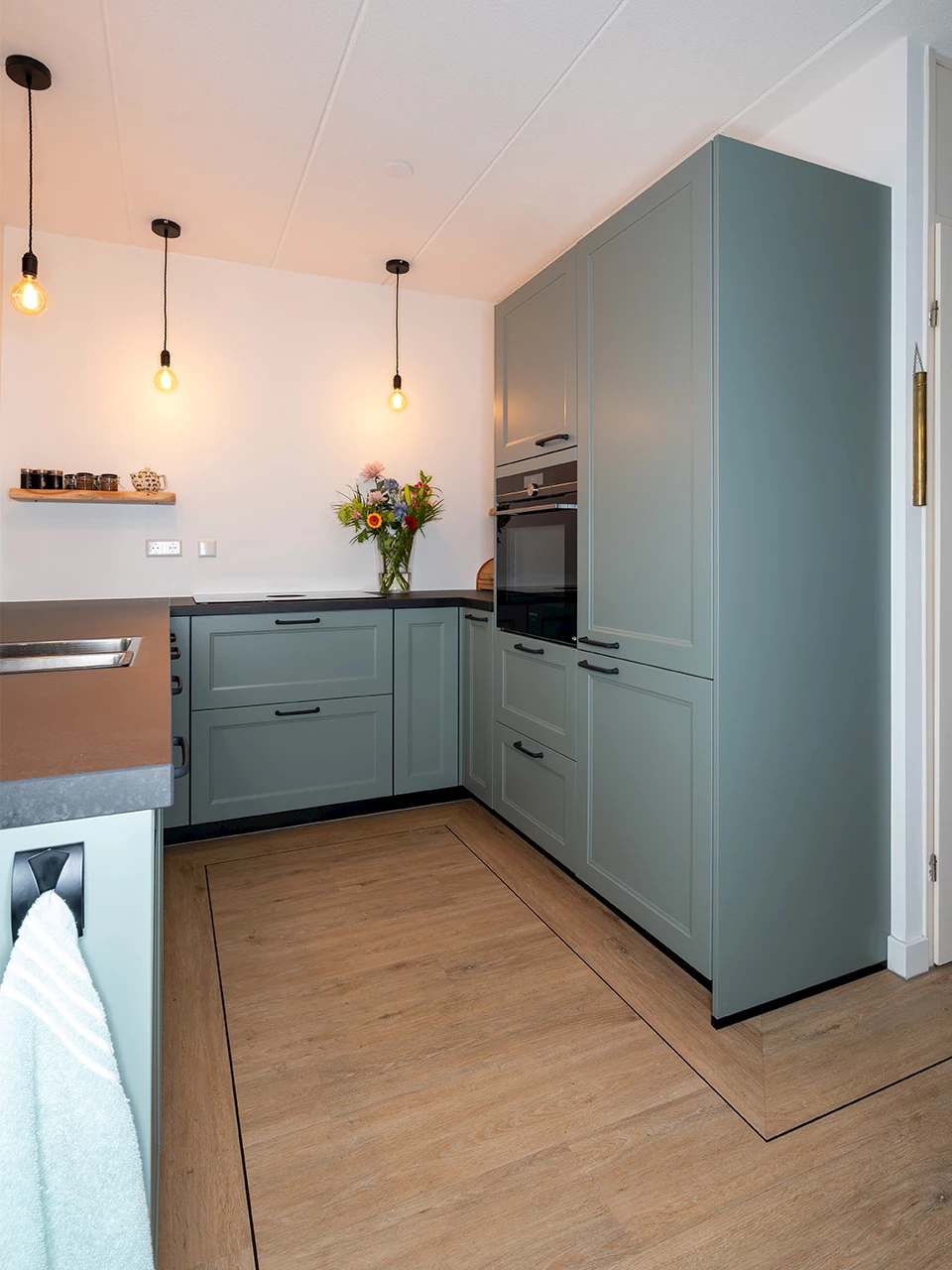 Gerrit & Ingrid hebben gekozen voor een keuken met een warme landelijke uitstraling. Deze ontstaat door de keuze voor de fronten met een raamoptiek in de kleur Riet. Op de fronten zijn gietijzeren grepen geplaatst, die door het design ook een landelijk look hebben. De warmgroene kleur van de fronten is gecombineerd met een keramieken werkblad in de kleur Virtual Black. De keuze voor een zwart werkblad maakt dat deze keuken een modern tintje heeft. Om het geheel af te maken is er gekozen voor een rvs-spoelbak en kokendwaterkraan.