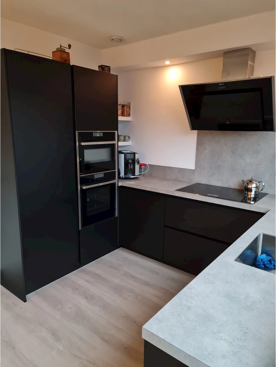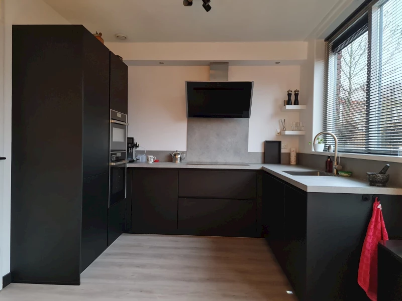 Deze keuken bestaat uit ‘super mat’ zwarte fronten en is dus echt mat zwart te noemen. Ook de greeplijsten hebben een zwarte kleur waardoor deze nauwelijks opvallen, dit zorgt voor een strak en modern geheel. Het top core betonlook werkblad heeft een lichte kleur en contrasteert prachtig bij de zwarte keuken! Om de strakke uitstraling van de keuken te behouden is er voor de spoelbak en de inductiekookplaat een uitsparing gemaakt. Hierdoor steken ze niet boven het werkblad uit, maar zijn deze verwerkt in het werkblad. De keuze voor een inductiekookplaat is gemaakt vanwege de vele voordelen die deze platen bieden. Zo gaan de kookplaten alleen aan als er een pan op staat. Hierdoor is het een zeer kindvriendelijk en veilig systeem. Boven de inductiekookplaat hangt een wandafzuigkap met randafzuiging. De afzuiging bevindt zich aan de randen, wat ervoor zorgt dat de lucht beter wordt weggezogen. Daarnaast zijn afzuigkappen met randafzuiging vaak stiller én makkelijker schoon te maken. De koel-vriescombinatie is voorzien van een paneeldeur, waardoor deze netjes weggewerkt is. Alle apparatuur die in deze keuken geplaatst is, is van het merk Neff.
